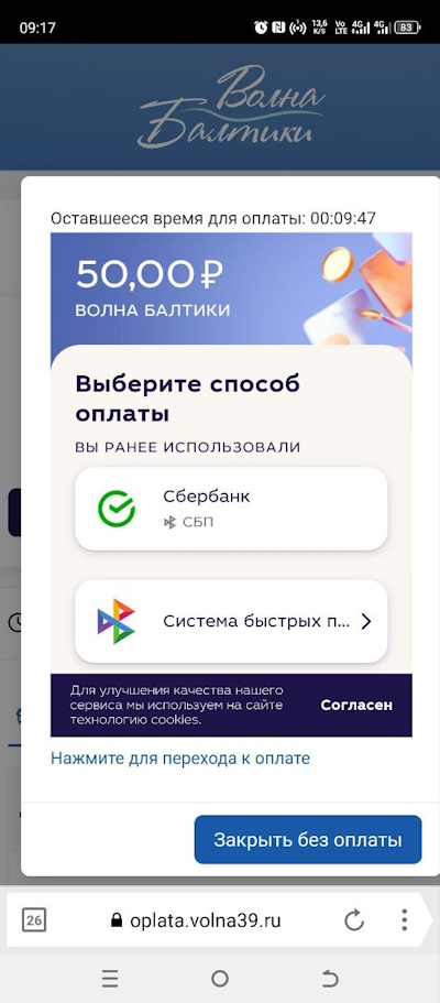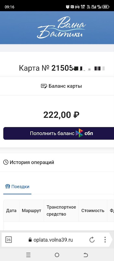 Ссылкой oplata.volna39.ru получилось воспользоваться уже только дома за компьютером. Когда я ввела номер карты, увидела информацию о своей последней поездке и баланс. Далее появился QR-код для оплаты. Но чтобы по нему перейти, нужно было навести на него... экран смартфона. При этом на операцию давалось 10 минут. Словом, в одной руке — мышка от компьютера, во второй — телефон. На смартфоне в Системе быстрых платежей я все равно перехожу в «Сбербанк Онлайн» (можно выбрать и другие банки) и пополняю через него свою транспортную карту.