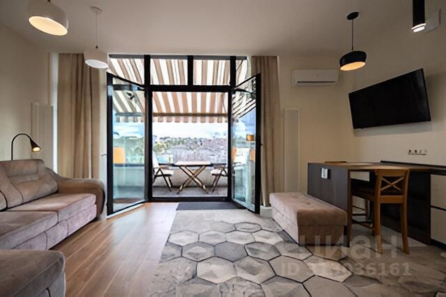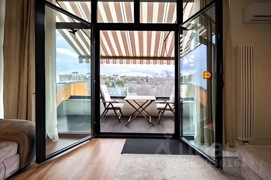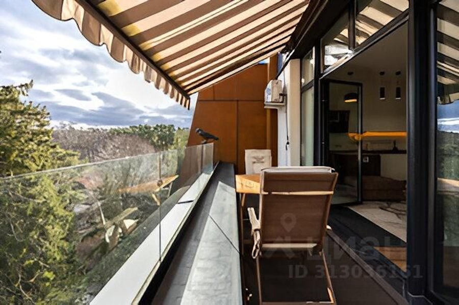 «Одна из стен панорамная с выходом на просторный открытый балкон площадью 8 м². Балкон оснащён маркизой с пультом дистанционного управления. Установлен датчик контроля силы ветра: при усилении ветра более определённого значения — маркиза складывается автоматически. Также установлены специализированные раздвижные сетки от насекомых», — гласит описание.