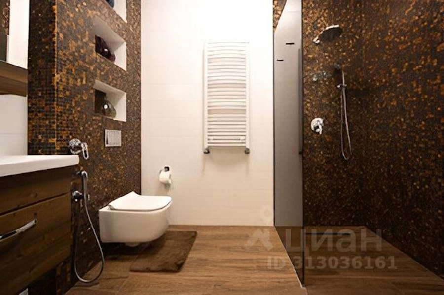 Квартира, как утверждается, готова к проживанию, ведь в ней, помимо дизайнерского ремонта, остаются «импортная бытовая техника и мебель», «хорошая посуда и столовые приборы», а также «постельные принадлежности, изготовленные на заказ». В совмещённом санузле — унитаз — инсталляция, гигиенический душ, душевая кабина с керамическим поддоном и стеклянным ограждением. Кухня со встроенной техникой и прихожая со встроенной мебелью прилагаются. Стоимость объекта — 31,5 млн рублей.