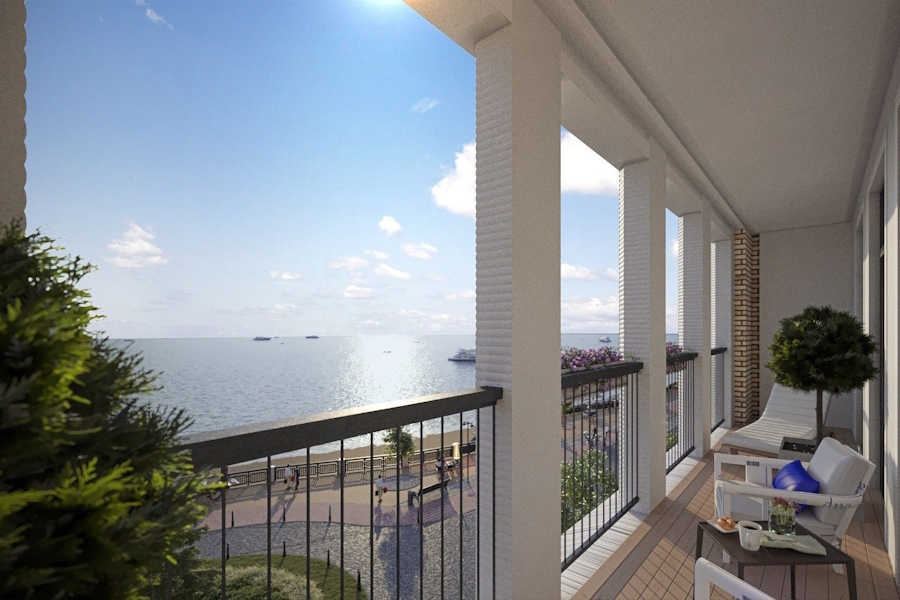В стоимость входят дизайнерские входные группы, бесшумные лифты, вентилируемые фасады, автономное газовое отопление. Потенциальным покупателям также обещают «панорамное остекление в пол и большой открытый балкон 30 м² с видом на море», трёхметровые потолки и «отличную планировку» с 19-метровой кухней, которая «порадует любую хозяйку», двумя «просторными комнатами» 19,7 и 22,4 м² и двумя санузлами. «Зелёный двор с современными детскими площадками, торговая галерея с кафе и ресторанами на первом этаже, подземный паркинг и кладовые помещения» прилагаются.