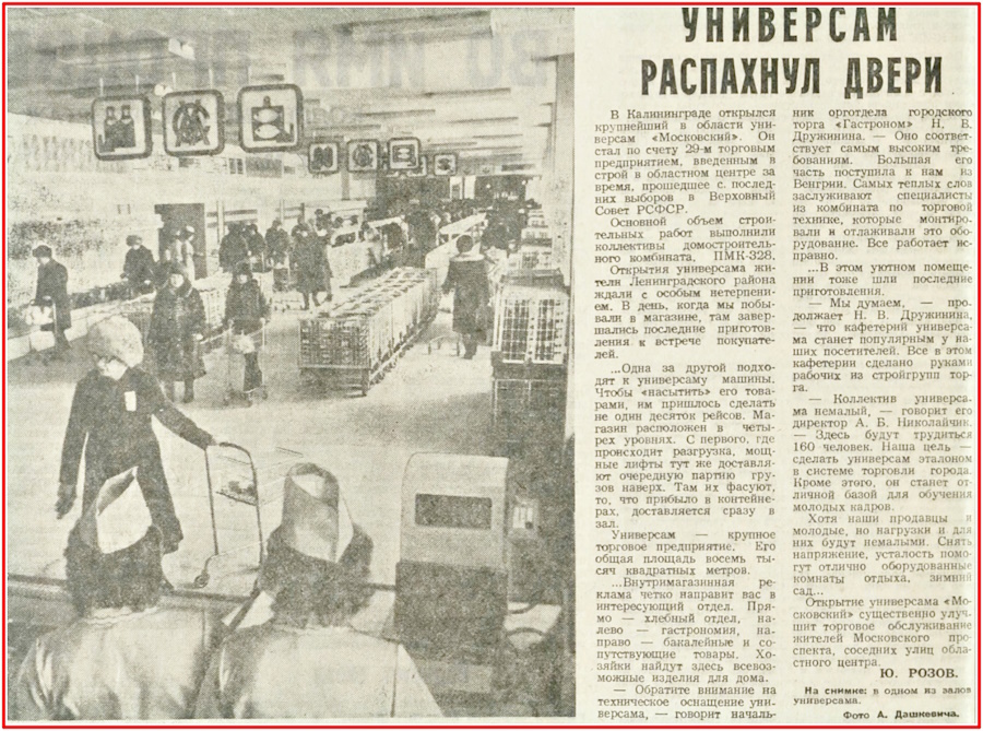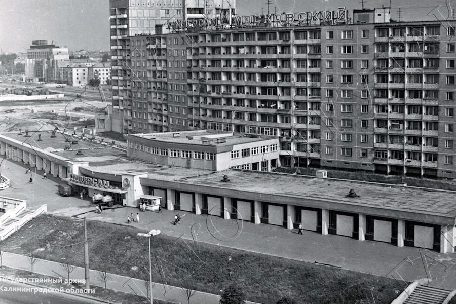 Первый в Калининграде универсальный магазин «Московский» был открыт в конце зимы 1985 года. Строительство затянулось — решение о возведении будущего универсама было принято ещё 2 марта 1974 года. О том, что он стал 29-м торговым предприятием, «введённым в строй в областном центре за время, прошедшее с последних выборов в Верховный Совет РСФСР», «Калининградская правда» оповестила своих читателей 25 февраля 1985 года.