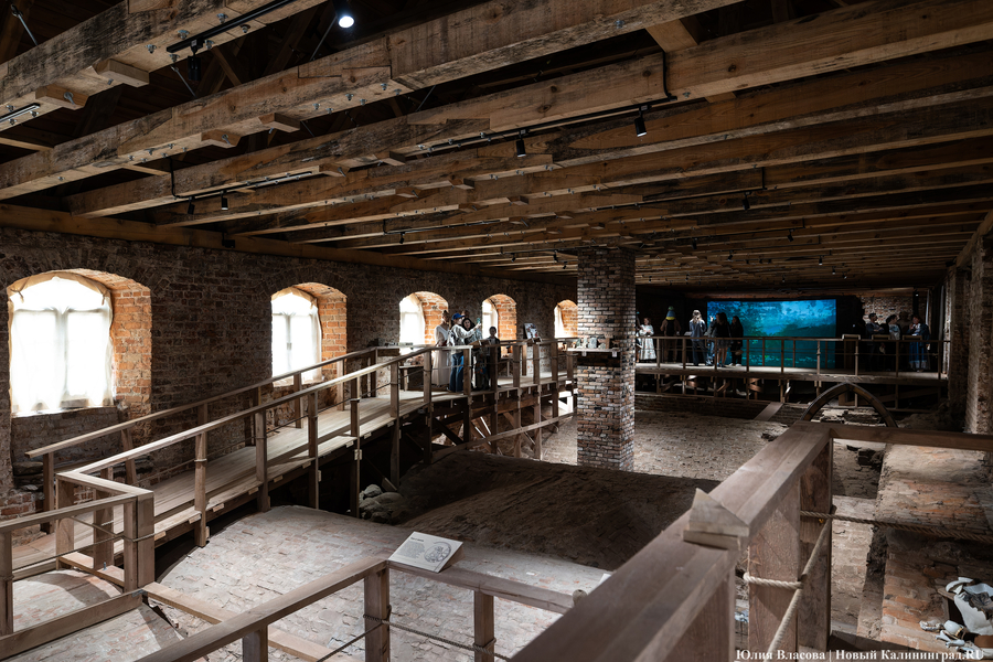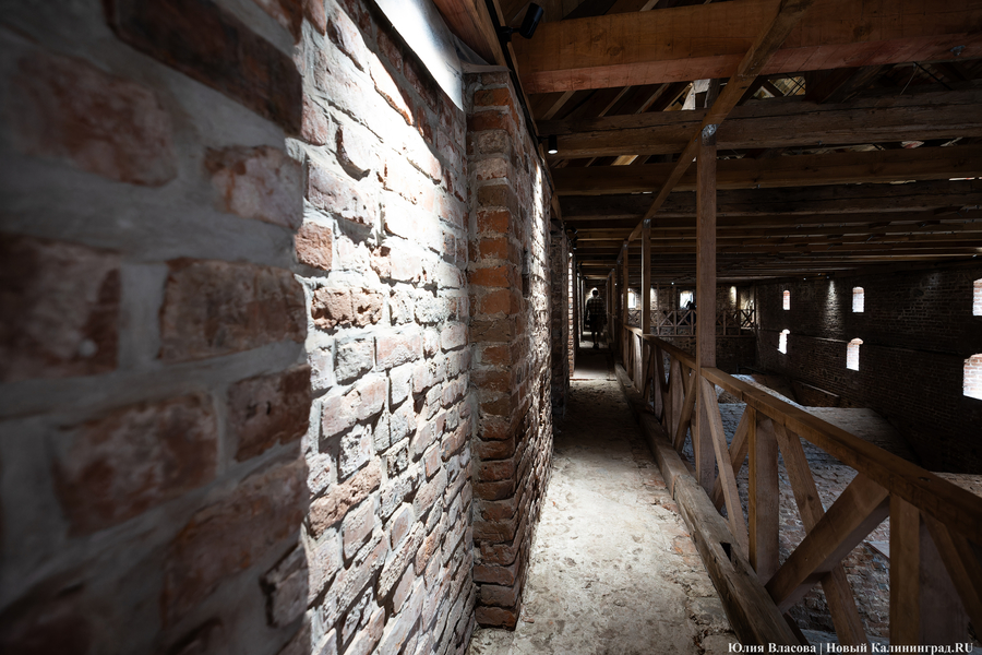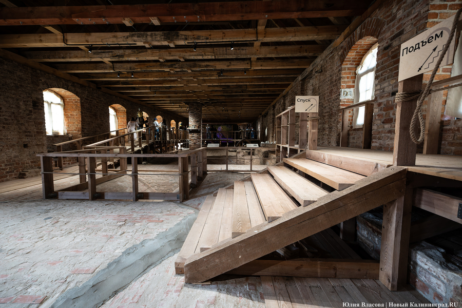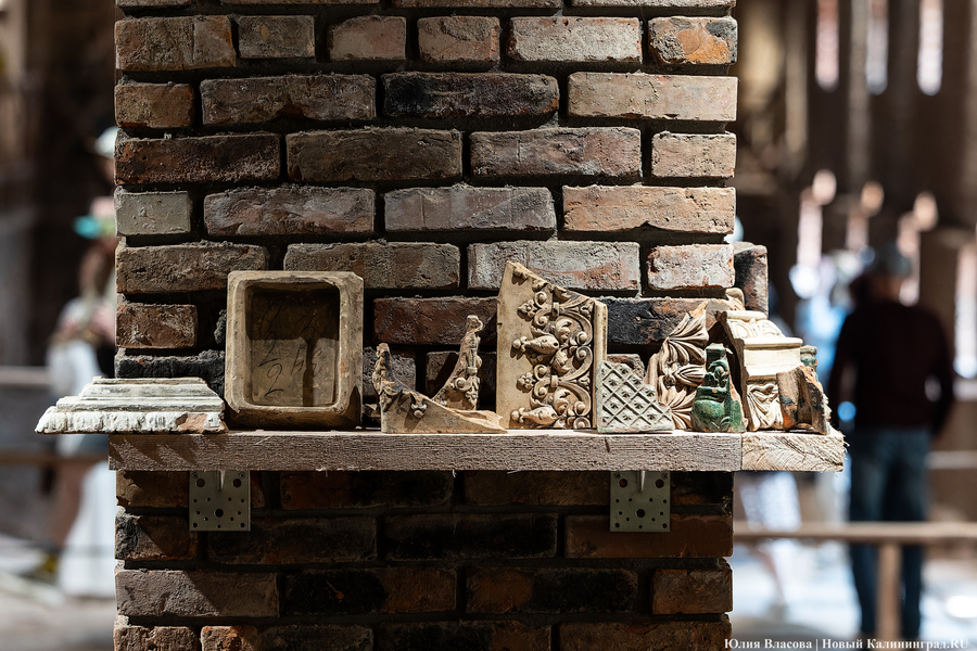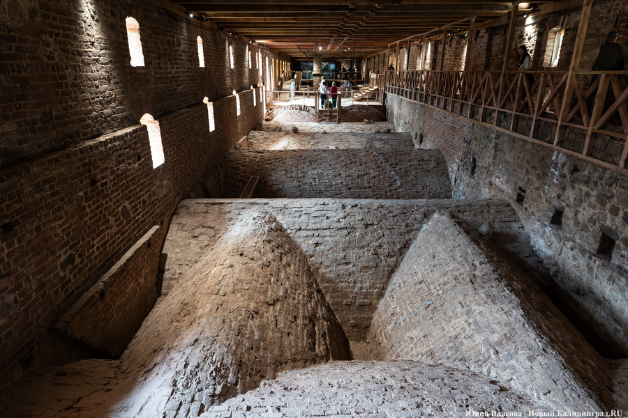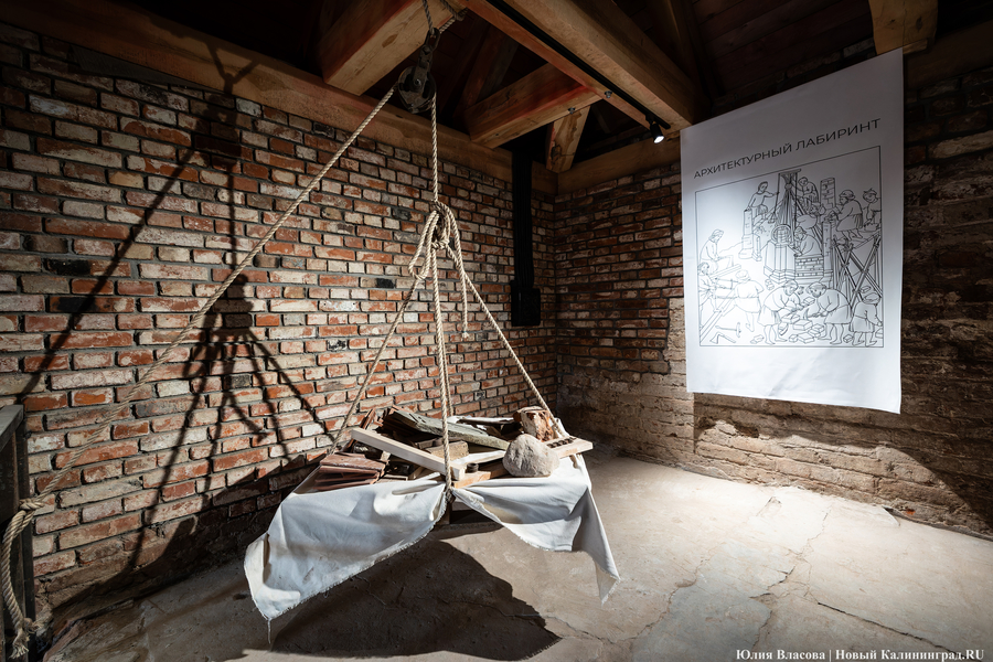 Основной объект показа в «лабиринте» — сохранившиеся до наших дней средневековые кирпичные своды, размеры которых действительно впечатляют. Есть тут и экспонаты, найденные во время работ по восстановлению и реставрации. По большей части это орденский кирпич с различными отметинами, клеймами и следами животных. А один из главных артефактов — кирпич ручной формовки со следом ребенка, оставленным несколько столетий назад.
