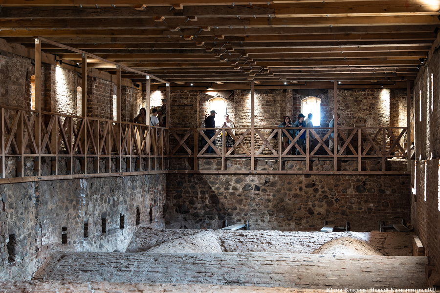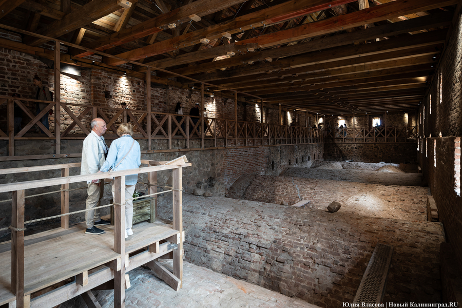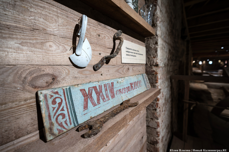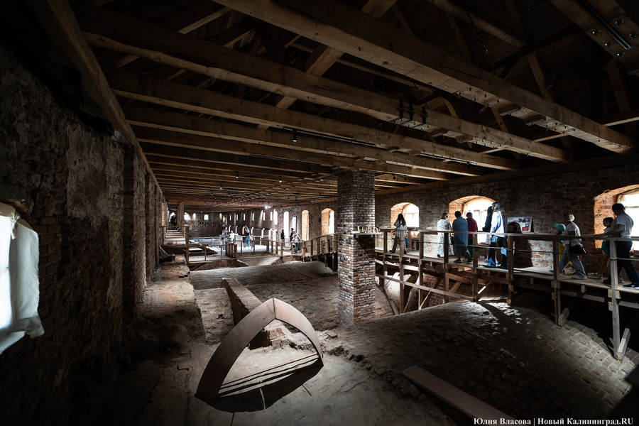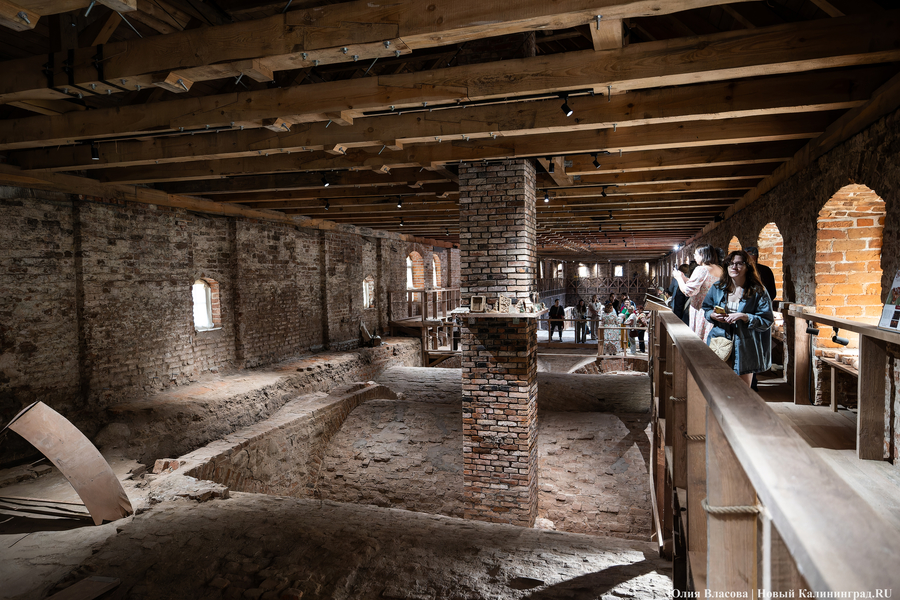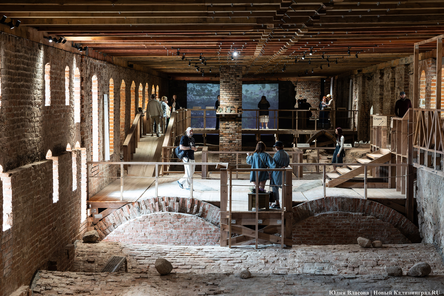 Основной объект показа в «лабиринте» — сохранившиеся до наших дней средневековые кирпичные своды, размеры которых действительно впечатляют. Есть тут и экспонаты, найденные во время работ по восстановлению и реставрации. По большей части это орденский кирпич с различными отметинами, клеймами и следами животных. А один из главных артефактов — кирпич ручной формовки со следом ребенка, оставленным несколько столетий назад.