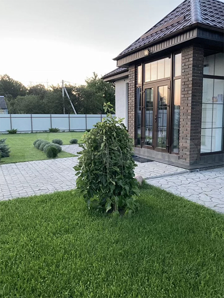 Площадь земельного участка — 12 соток. На нём расположены теплица и летний душ, высажены молодые плодовые деревья: яблони, вишня, слива, грецкий орех, ежевика. Внутренняя граница участка «выходит на просторный луг». Под боком — небольшие озёра и речка Любимая, а также лес, «богатый грибами, ягодами и зверем».