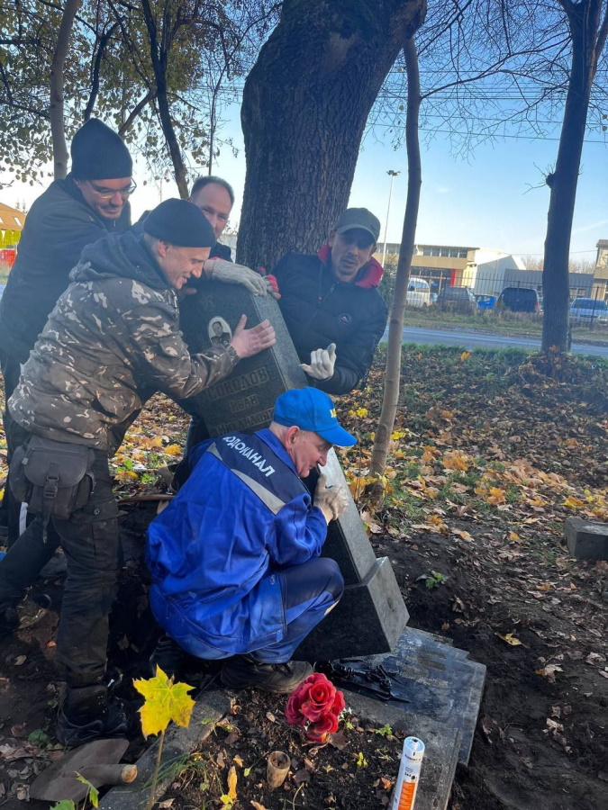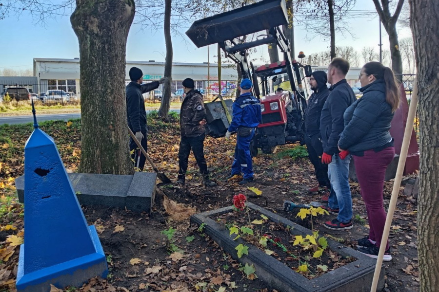 «Восстановили стелу ребята из „Русской общины“, — сообщила Мария Кохановская. — С помощью трактора, предоставленного МБУ „Чистота“, они поставили её на место. Если помните, стелу хотели восстановить сотрудники РЖД, а потом начальник кладбища с проспекта Мира обещал, что лично всё сделает, но до этого почему-то не дошло. Зато ребята сами всё сделали».