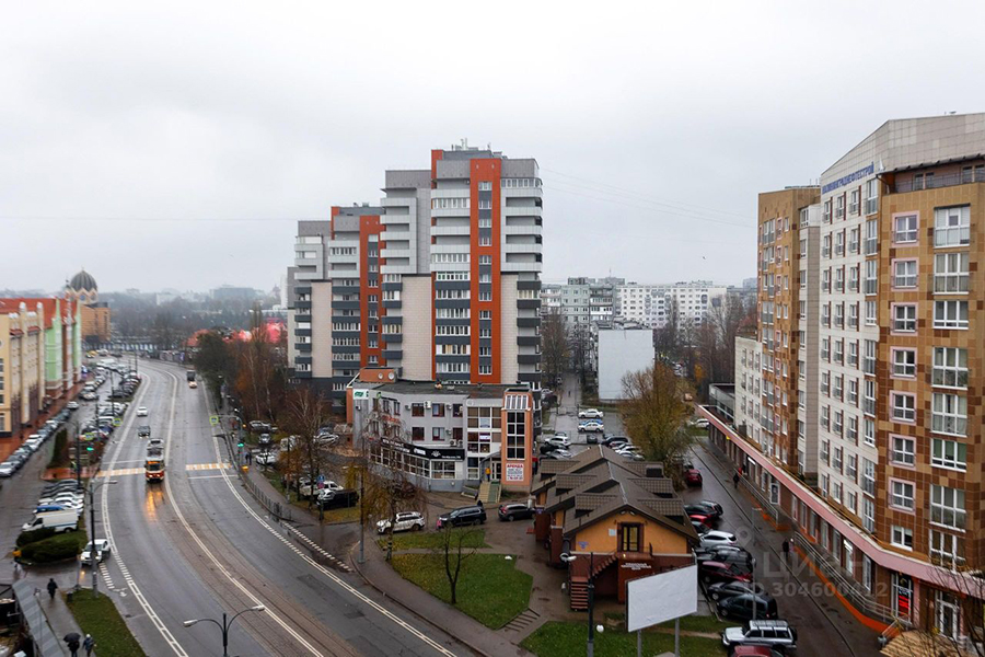 Однокомнатная квартира площадью 44,7 м² расположена на последнем этаже семиэтажки на проспекте Калинина, сданной в 2024 году. Площадь кухни — 14,7 м². ЖК бизнес-класса находится в историческом центре Калининграда. Его «изысканная архитектура», по мнению автора объявления, «уже стала новой визитной карточкой города, которая идеально гармонирует с уникальным месторасположением». Местоположение, надо сказать, и правда довольно незаурядное: рядом проспект Калинина с его регулярными пробками, второй эстакадный мост и парк «Южный» (ранее известный как парк 40-летия ВЛКСМ).