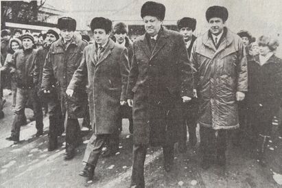 «У проходной Бориса Николаевича уже ждали рабочие и служащие предприятия. Поговорить, поделиться мыслями о возникающих что ни день проблемах, да и просто посмотреть на того, чьё имя давно стало символом определенных сил и процессов, захвативших наше общество. Ельцина окружают плотным кольцом заводчане.
