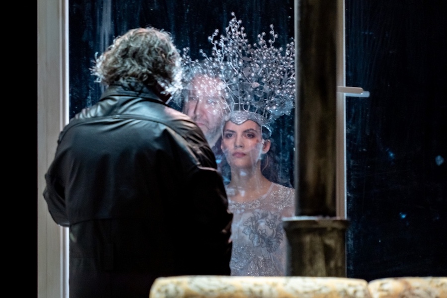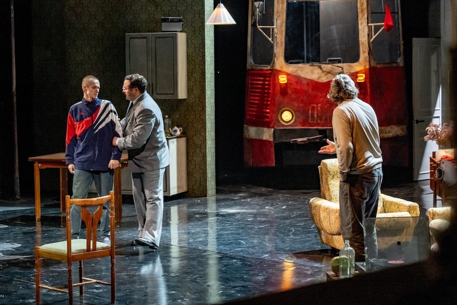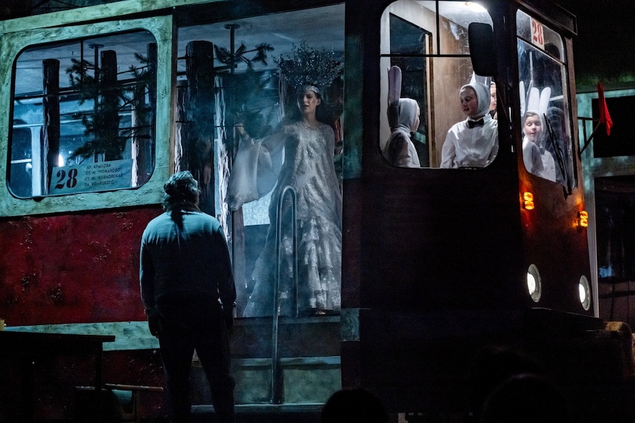 Трамвай в спектакле Романа Габриа играет, как представляется, несколько иную роль. Это что-то неотвратимое, то, что движется по рельсам, которые проложил не ты. Трамвай, как беда, способен ворваться в твое жилище, и единственное, чем ты можешь противостоять вторжению, — не замечать его. Персонажи пьесы, собственно, так и поступают. В их квартиру въехал трамвай, а они делают вид, что его нет. Живут, разговаривают, пьют, заходят в салон «за бокалами». Прямо как в басне Крылова: «Слона-то я и не заметил». Что за всем этим скрывается? Трудно сказать. Наверное, инфантилизм. Детская уверенность, что, если проблему игнорировать, она исчезнет. И если знавших об измене Елены родственников Дмитрия тут хоть как-то можно понять, то его самого — очень сложно. Но, с другой стороны, такая модель поведения представляется наиболее психологически комфортной...