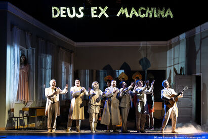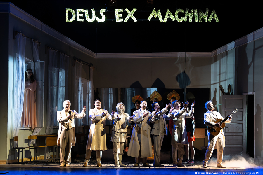 А заканчивается представление скорее как водевиль, где главными «действующими лицами», пожалуй, являются русские классики — Лев Толстой, Федор Достоевский, Антон Чехов, Николай Гоголь, Михаил Лермонтов, Иван Тургенев. Будучи представленными как карикатуры на самих себя, они подолгу и с увлечением спорят о литературе. В частности, о советской (!). Как показалось, самый строгий её критик, согласно задумке создателей спектакля, почему-то Тургенев, который назвал советскую литературу «добровольным инвалидом, положившим свои конечности под бензопилу цензуры». Даже таким бескомпромиссным авторам, как Венедикт Ерофеев и Михаил Булгаков, от него досталось на орехи.