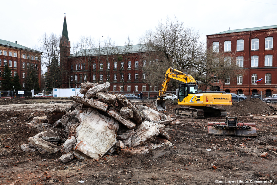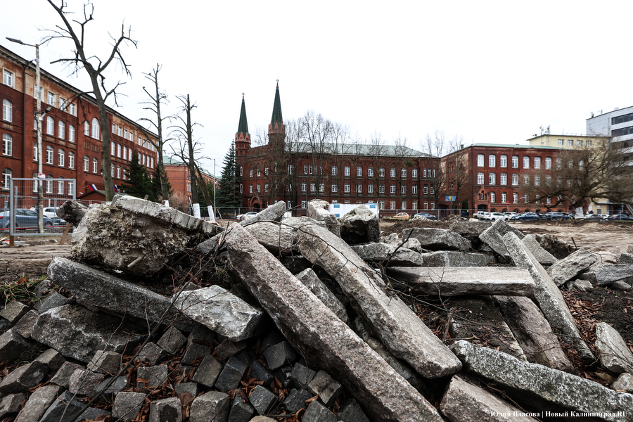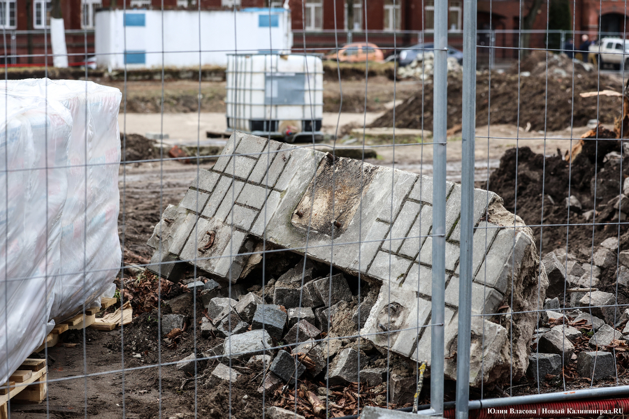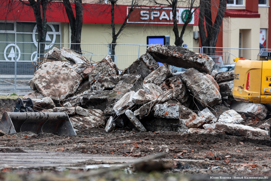 В знаменитом сквере у «мореходки», который приходил в запустение последние десятки лет, мы побывали 17 марта. Территория огорожена забором, стволы деревьев укутаны, чаша фонтана советских времён демонтирована, вокруг груды земли, осколки кирпичей и обломки бетона с арматурой . Между тем с официального старта работ прошло уже больше полугода. О нём, напомним, заявлял президент ГК «Эталон» Михаил Бузулуцкий в интервью изданию «Коммерсант». Он говорил, что Калининград для «Эталона» — территория стратегического интереса, в регионе виден потенциал, и застройщики готовы инвестировать: строить жилье, создавать инфраструктуру, развивать общественные пространства. И что планируется воссоздать сквер у КМРК в самое ближайшее время, сделать его «местом, куда захочется возвращаться», поскольку «общественные пространства представляют собой стратегическую инвестицию в устойчивое развитие городской среды и повышение качества жизни горожан» и т.д. и т.п.
