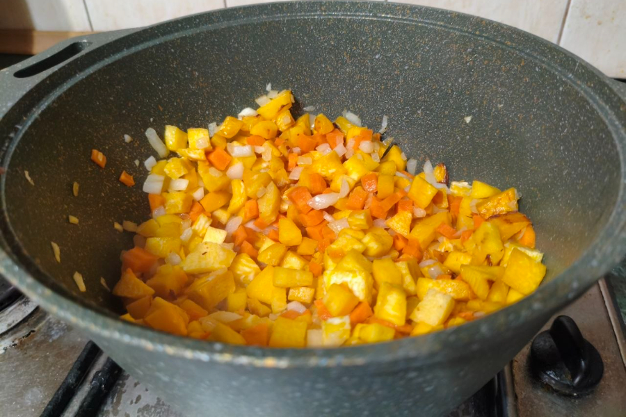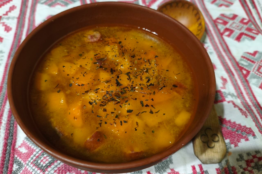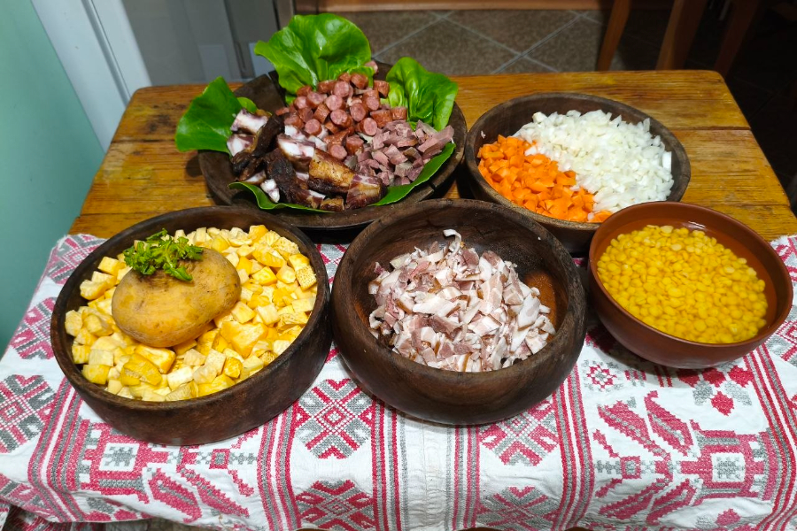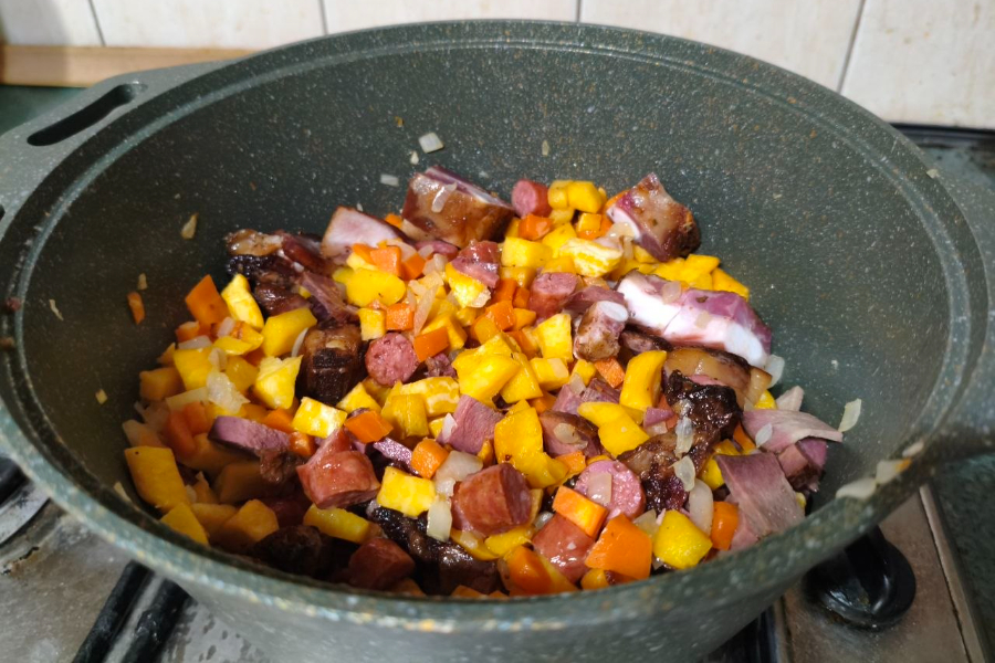 Похлёбка получается густой, насыщенной и с выраженным ароматом копченостей. Сначала из мелко нарезанного сала вытапливают жир, на котором обжаривают репу, лук и морковь. Затем добавляют копченое мясо и ребра, слегка прогревают все вместе и только после этого вводят заранее замоченный горох. Блюдо варится на медленном огне не меньше часа — за это время горох разваривается, а бульон становится плотным и насыщенным.