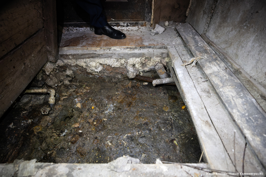 «Если в прошлый раз мы с вами в том же техническом подполье видели трубы, то сейчас их нет. Вот здесь, — показывает нам Анастасия, — они должны проходить, но вместо труб, извините, мы видим бумагу, фекалии и т.д. И все это уже идет в квартиры на первых этажах прямо из-под пола. Согласно пояснениям управляющей компании, им сейчас приходится уже два-три раза в неделю чистить все эти коммуникации для того, чтобы откачать скопившуюся жидкость . Но ситуация не решается, потому что сети сильно изношены».