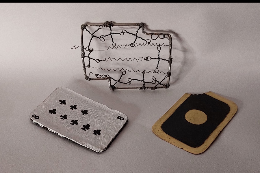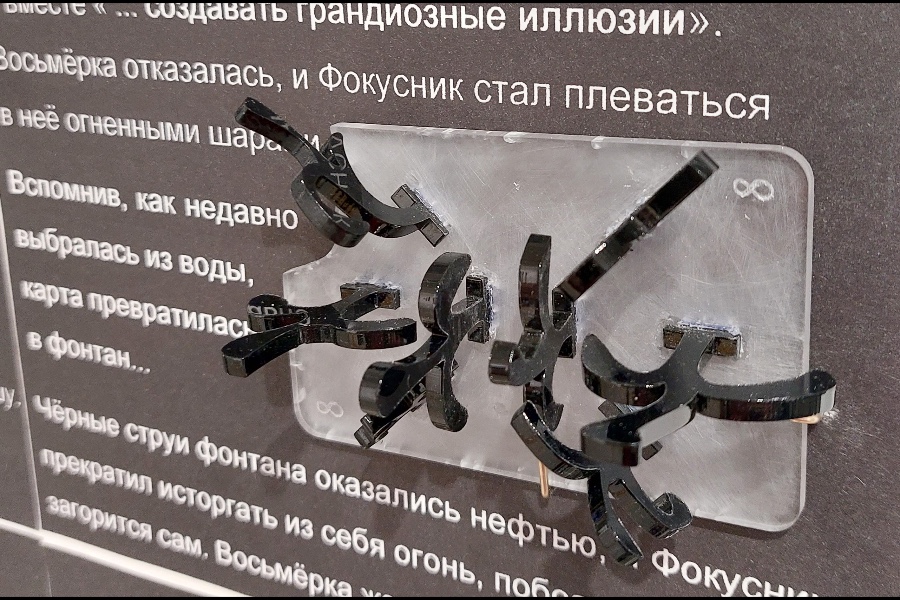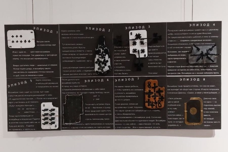 Есть у меня проект о приключениях крестовой восьмёрки. Называется он «Где вы били восемь треф». Это сказка, которую я представляю в виде моноспектакля, но также она существует в форме арт-объекта. Это доска, разделённая на восемь зон, иллюстрирующих восемь эпизодов сказки. Когда я читаю сказку, я вешаю внутрь этих зон «сказочные» воплощения моей крестовой восьмёрки — это как бы маленькие скульптурки из картона, дерева, пластика и других материалов.