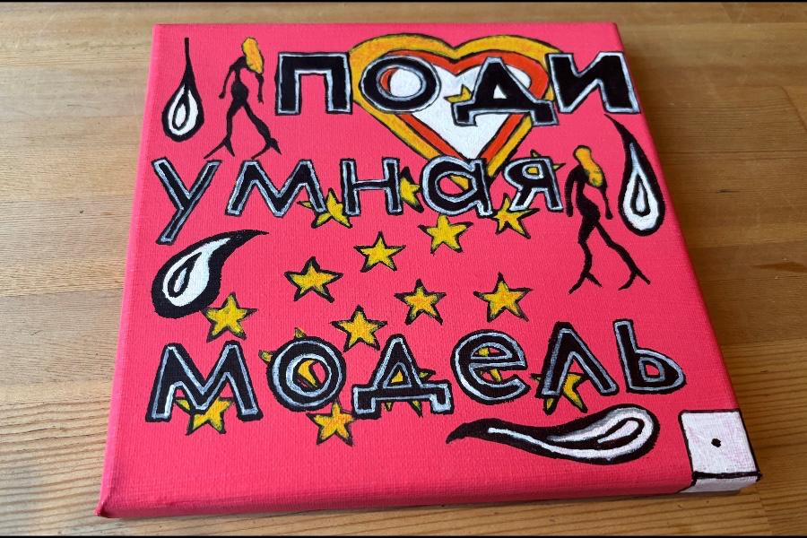 Я вообще очень люблю анаграммы — художественные их возможности. Делал даже выставку в «Баре Советов» под названием «В плену анаграмм». На холстах тоже пишу. Вот, кстати, работа — я принес её с собой. Пока нигде не выставлял. Это, как видишь, сюжет, основу которого составляет надпись «Поди умная модель». То есть, с одной стороны, это ироничное предположение, а с другой, можно прочитать «Подиумная модель». Игра слов...