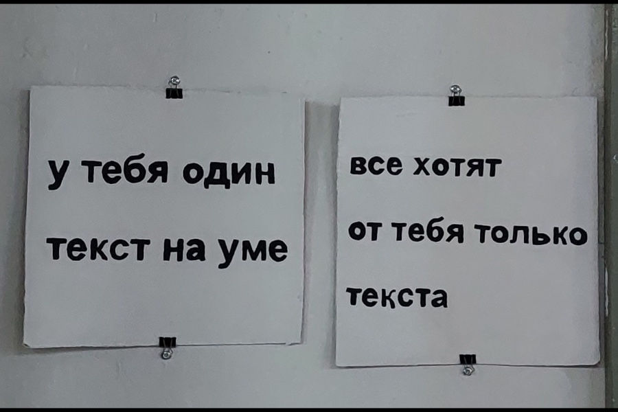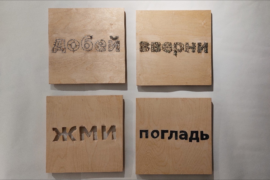 У меня то же самое, но с текстом. Другое дело, что в социальных сетях мне стало со временем тесно, и я начал писать тексты на картоне, фанере. Стал участвовать даже в выставках. В 2023 году около 60-ти моих текстов и чего-то вроде рисунков из текста долгое время висели в библиотеке имени Чехова. Словом, я соединил текст и современное искусство и стал всё больше уходить в создание инсталляций, арт-объектов. У меня, например, есть проект «Моя вторая кожа». Это четыре фанерные доски, на каждой из которых написан побудительный глагол. Например, «Жми», но жать не на что — слово это выпилено. На другой доске буквами из наждачной бумаги написано «Погладь», на третьей из вкрученных шурупов выведено слово «Вверни», на четвёртой гвоздями выбито «Добей». Это всё про мужские переживания. Типа, когда мужчина не может высказаться, он как бы наращивает вторую кожу, своего рода рыцарскую броню. Он как бы страдает, но не показывает этого, а наоборот, провоцирует. Эта серия выставлялась в прошлом году в рамках проекта «Опыт касаний», куратором которого была Юлия Горбунова.