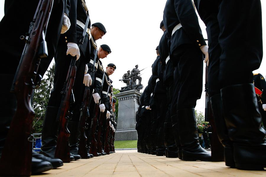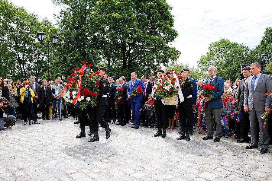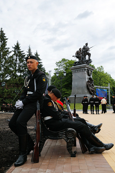 На входе в сквер стояли полицейские с металлоискателями в руках. Правда, за все время торжественных мероприятий металлоискатели остались незадействованными. На скамейках сидели морские пехотинцы с красными повязками на рукавах. Рядом стояли увешанные орденами казаки в синей форме, около памятника выстроились солдаты в форме времен Первой мировой войны — калининградские реконструкторы. Неподалеку от сквера по траве бегали младшеклассники, которых, вероятно, привели на праздник из школы неподалеку.