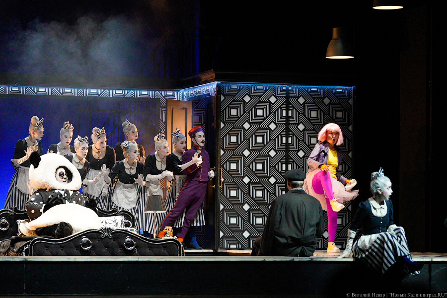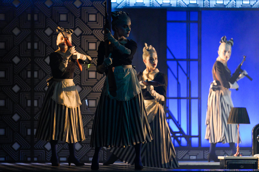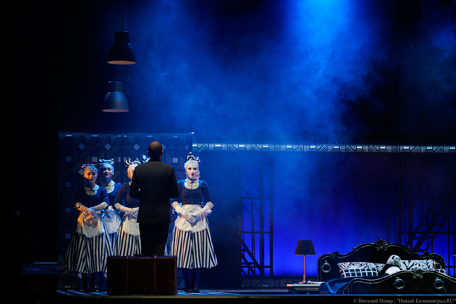 На сцене — типичная картинка из американского кино — гостиничный номер, горничные в накрахмаленных белых фартуках, портье в форменной фуражке, но снимали этот фильм будто Тим Бёртон в тандеме с Уэсом Андерсеном. Легко представить, что служанки с выбеленными лицами и в полосатых платьях а-ля миссис Ловетт из «Суинни Тодда» убирают номер отеля «Гранд Будапешт». Хоть Владимир Панков и утверждает, что не смотрит, а слушает спектакли, все его работы выверены визуально.