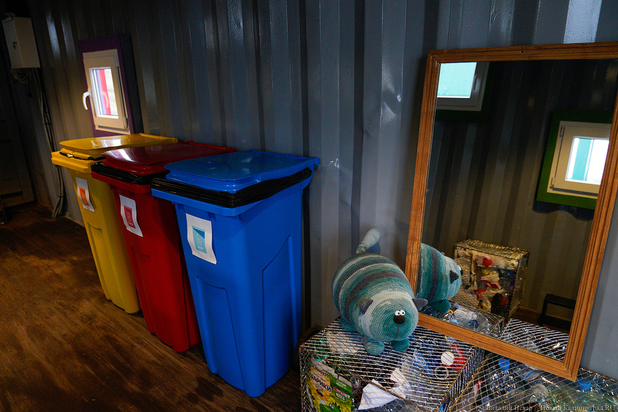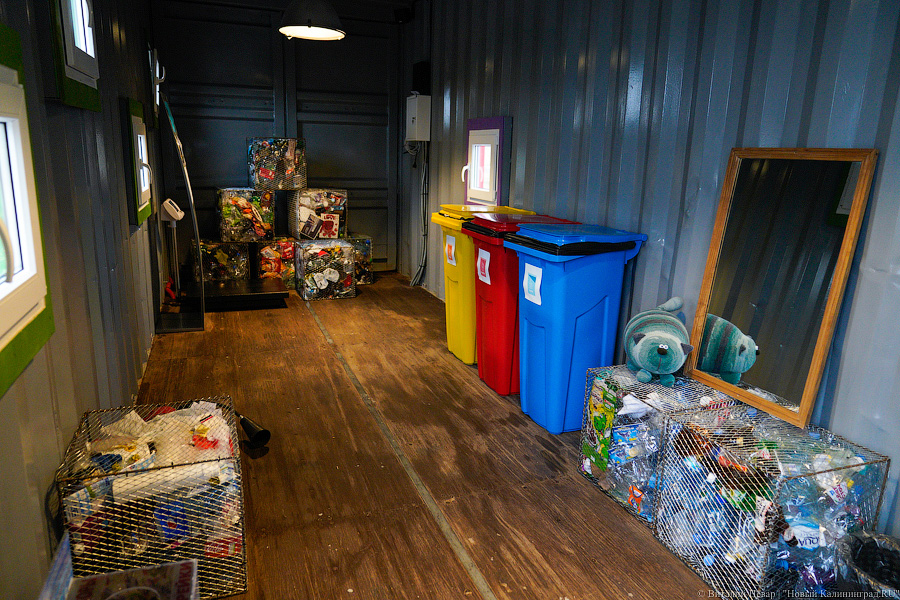 Большинство продающихся здесь сувениров сделано из вторсырья. Отходы, которые могут пойти на переработку, на Экоплощадке тоже собирают — макулатуру, ПЭТ (обычные прозрачные пластиковые бутылки), алюминиевые банки. Их сюда могут привозить и за символические деньги сдавать все желающие. Например, 1 кг макулатуры стоит рубль — можно получить деньги, а можно копить баллы, которые пойдут в зачет стоимости билета в музеи ГРЦ «ПАРАDOX» («Мурариум», «Домик Ангелов», Черепов и скелетов, «ФилоСовия»). Отходы будет вывозить проект «Зеленое дело» — оператор раздельного сбора мусора с контейнерных площадок в Калининграде.