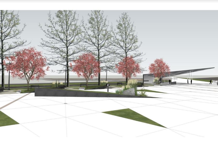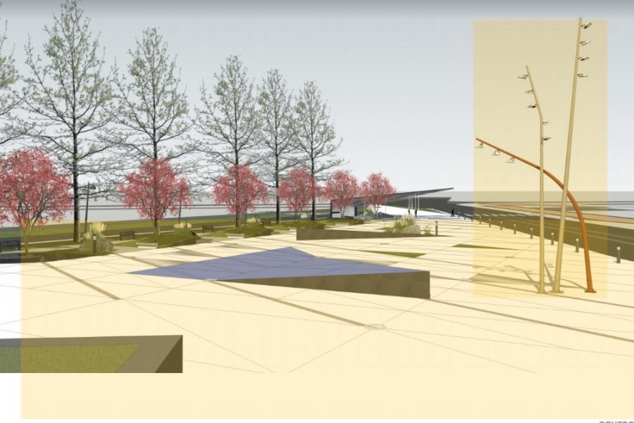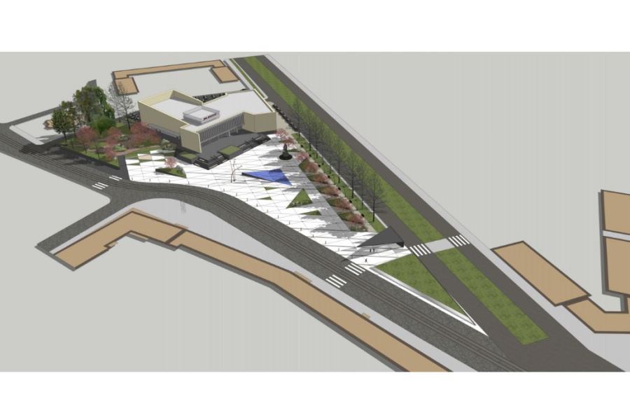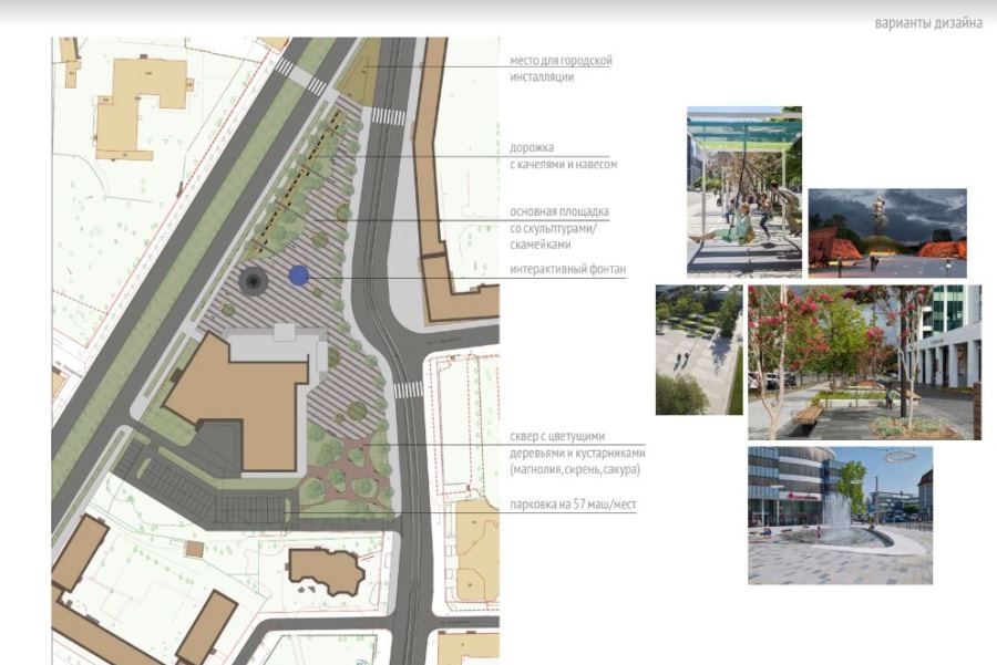 В частности, предлагается передвинуть памятник Ленину, установить треугольный «интерактивный фонтан» вместо существующего, построить дорожку с навесом и качелями и оборудовать место для «городской инсталляции». Слева от здания архитекторы предложили разбить сквер с магнолией, сиренью и сакурой, а за ним — оборудовать парковку на 57 машиномест.