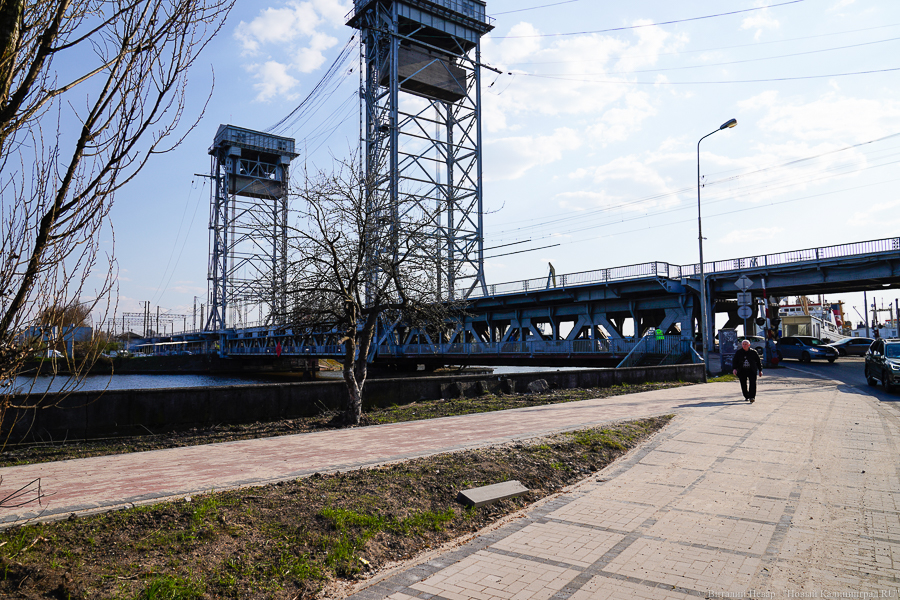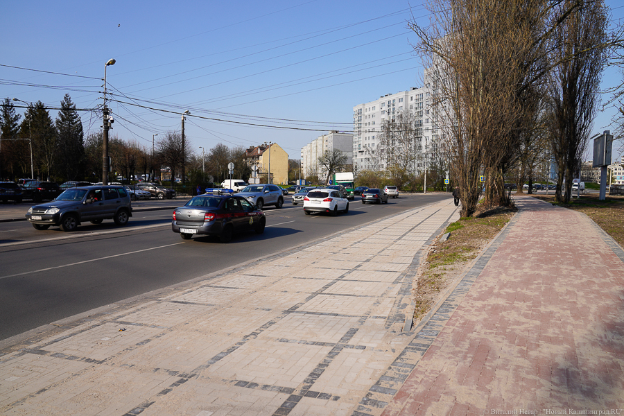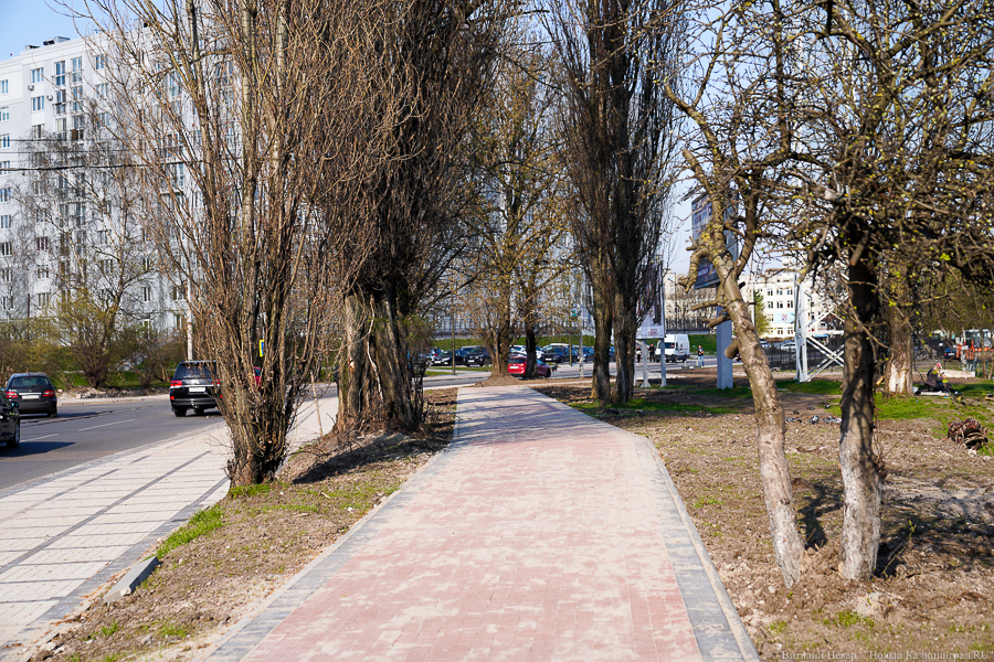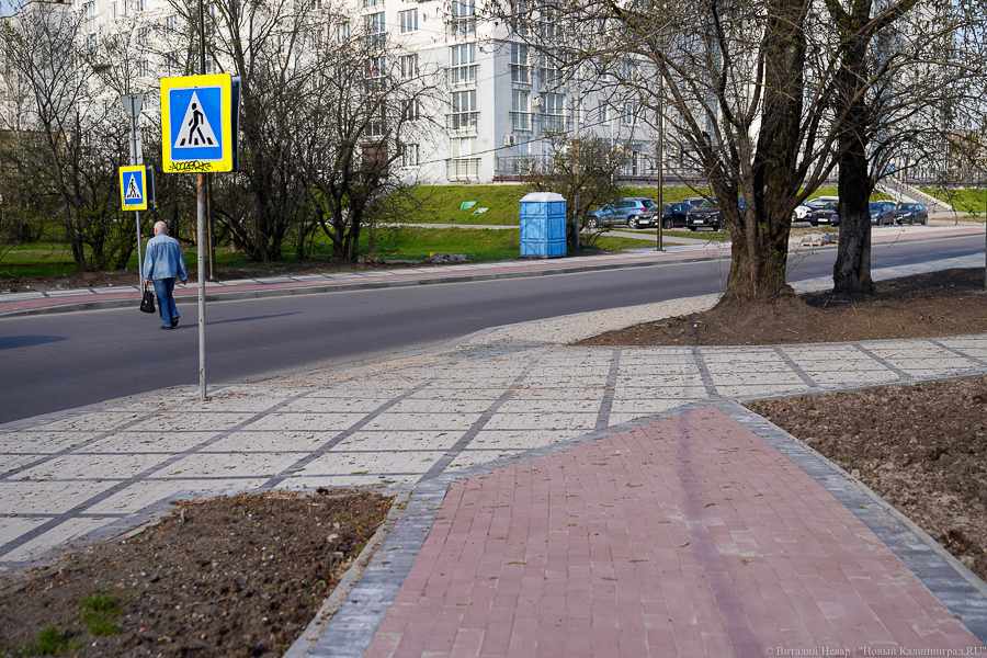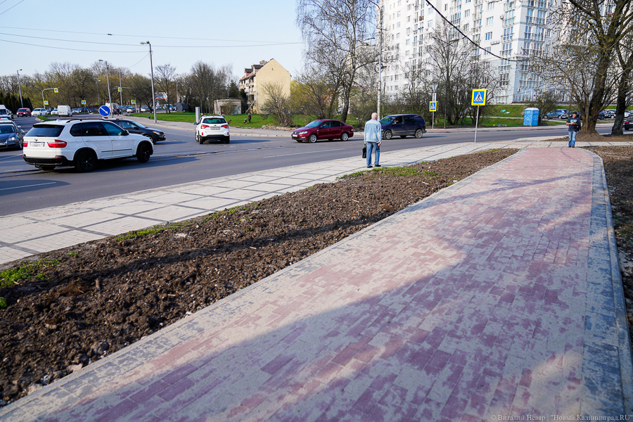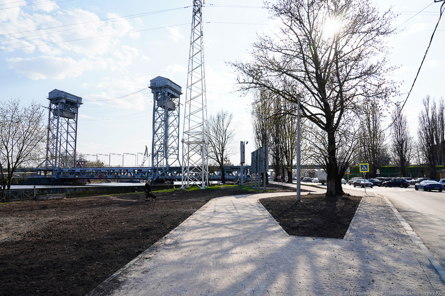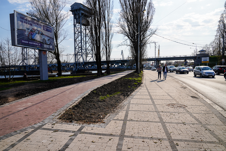 На ул. Баграмяна практически завершился ремонт, на днях рабочие уложили тротуарную плитку на участке между корпусом «Куб воды» Музея Мирового океана и двухъярусным мостом. Тротуара здесь практически не было, а территория у набережной представляла собой вытоптанный пустырь — сейчас на ней отвели место под газоны и обустроили дорожки.