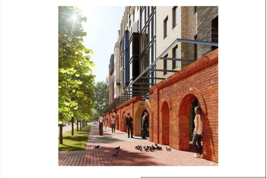 «На уровне первого этажа — стена ранее существовавших складов, которую мы хотели бы сохранить. На данный момент она законсервирована и будет примыкать к жилому комплексу, там будет устроена торговая галерея», — пояснил представитель застройщика.