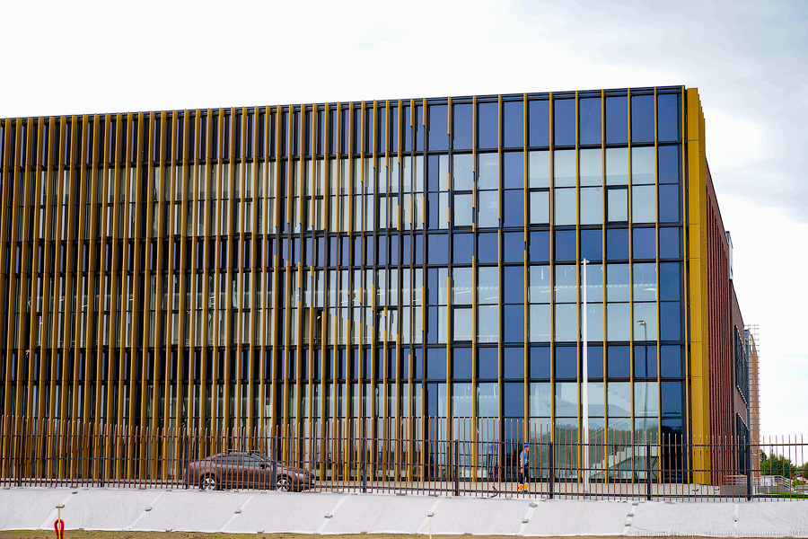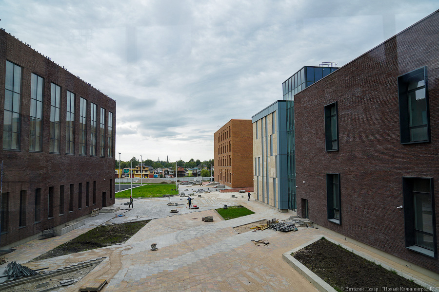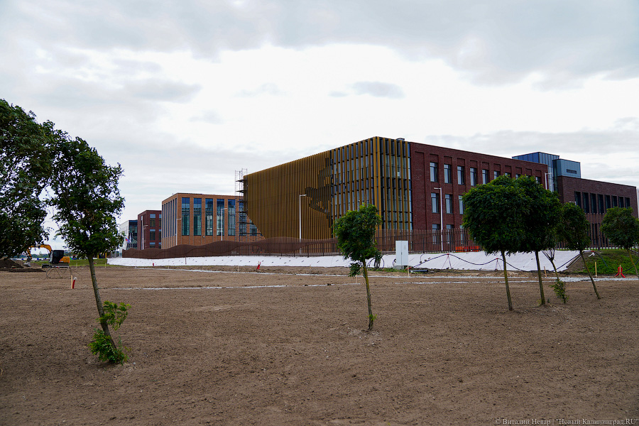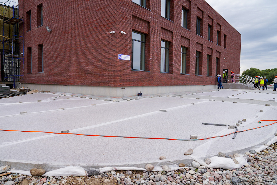 Благоустройством в «Стройтрансгазе» явно гордятся не меньше, чем самой стройкой. Например, дизайн композитного забора разрабатывал главный архитектор области Евгений Костромин (говорят, бесплатно). На входах в учебные корпуса — покрытие с подогревом, чтобы не образовывалась наледь. На прилегающей территории сейчас выращивают газонную траву, планируют озеленение, ставят спортивные площадки и уже установили детские игровые (зачем они тут — не совсем ясно, даже у младших школьников они вряд ли будут бешено популярны).