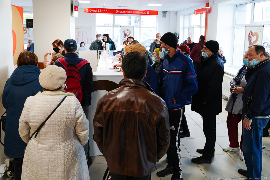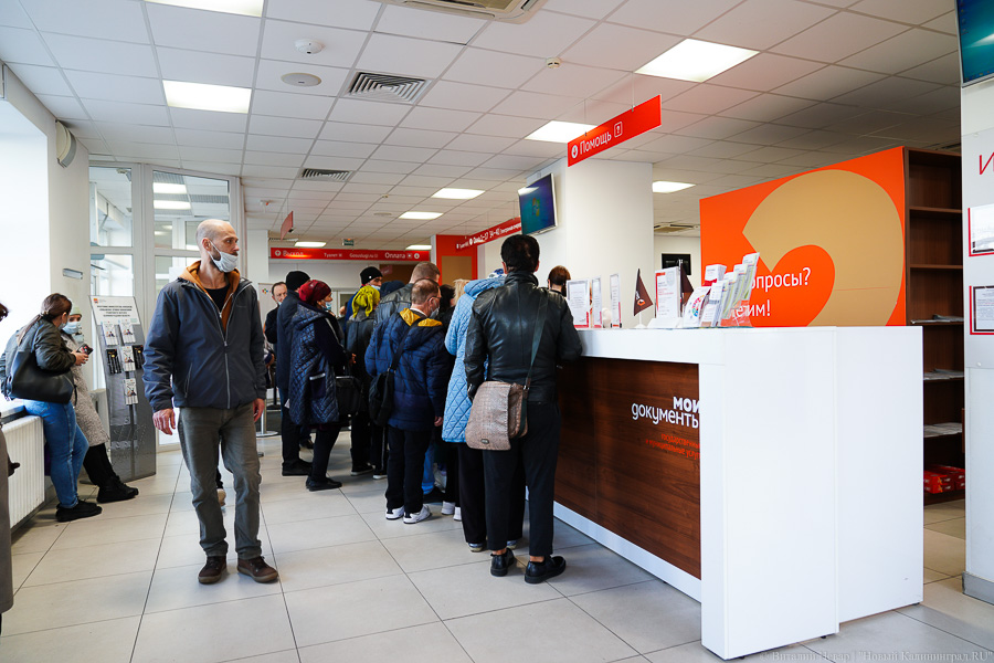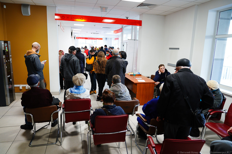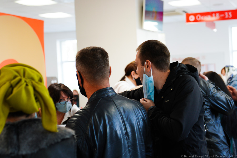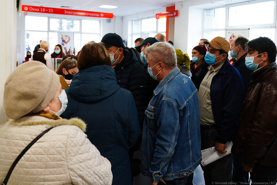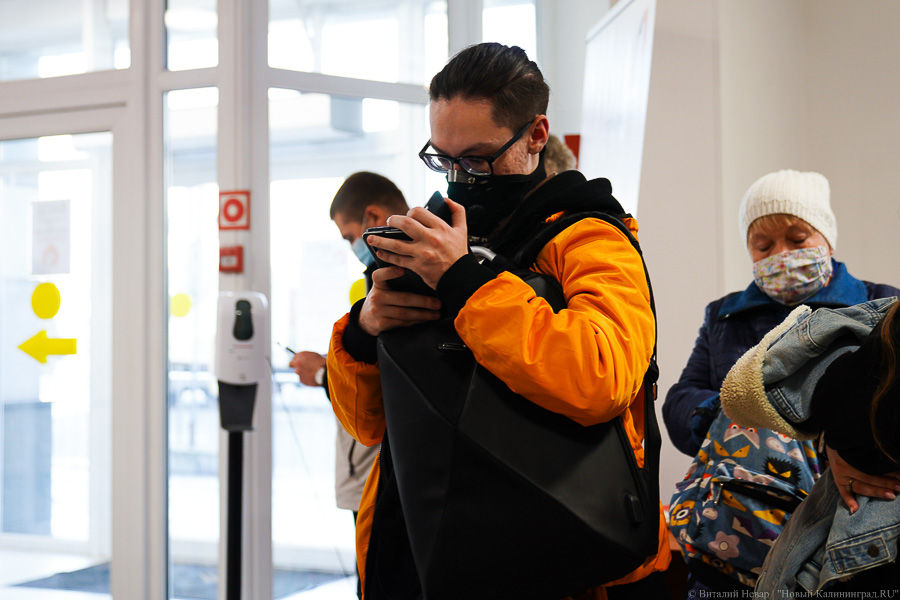 После объявления новых мер в регионе резко увеличилось количество желающих вакцинироваться от коронавируса. Однако очереди образовались не только перед мобильными пунктами, но и в МФЦ. Туда чиновники отправляют тех, кто не имеет возможности показать QR-код в телефоне или получить доступ к нему. В многофункциональном центре на площади Победы в последние дни наблюдаются масштабные скопления людей. Посетители часами стоят в очереди, чтобы распечатать свой QR-код или подтвердить учётную запись на портале госуслуг. За происходящим наблюдал фотокорреспондент «Нового Калининграда» Виталий Невар.