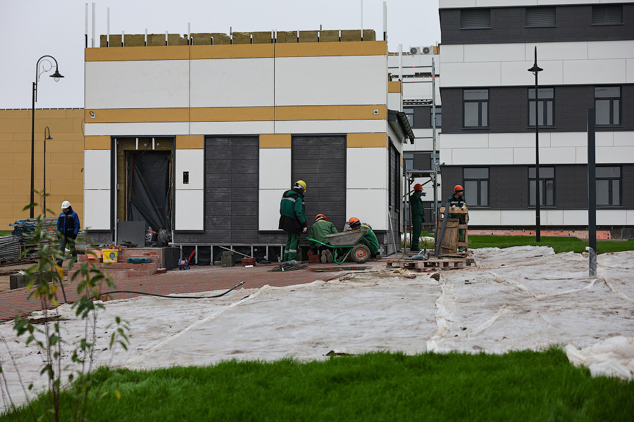 На конец ноября стоит задача «завершить все работы по благоустройству, высадить все компенсационное озеленение и дальше заниматься только чистовой отделкой внутренних помещений после того, как будет установлено все тяжелое оборудование». По словам представителя компании-подрядчика, дефицита материалов на стройке сейчас сейчас нет. На стройке в две смены сейчас работают порядка 700 человек.