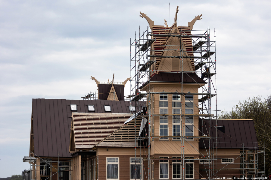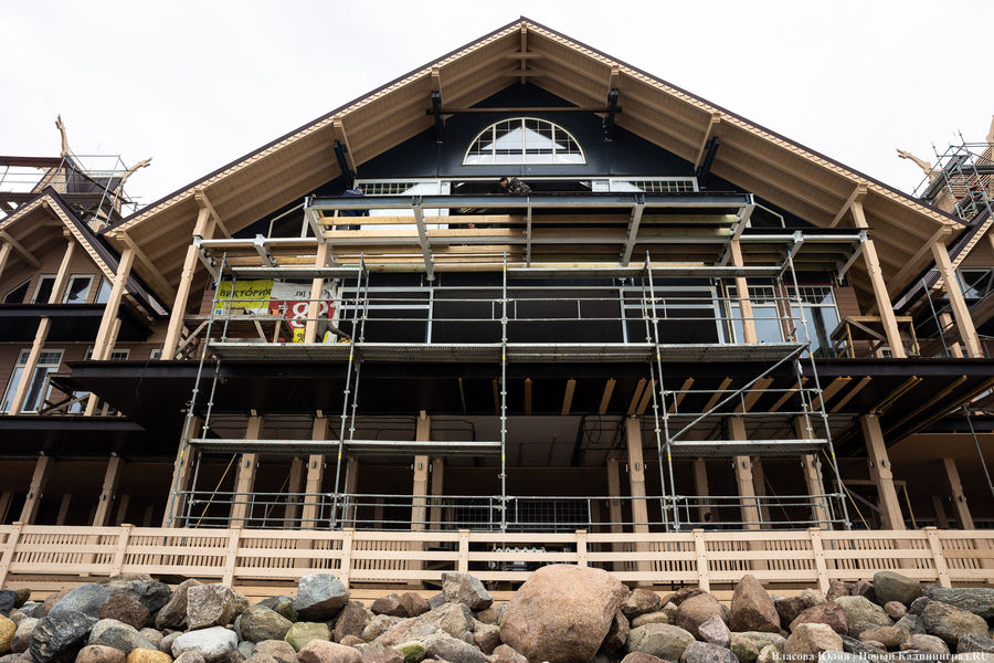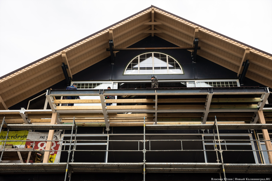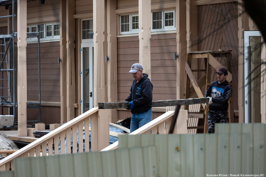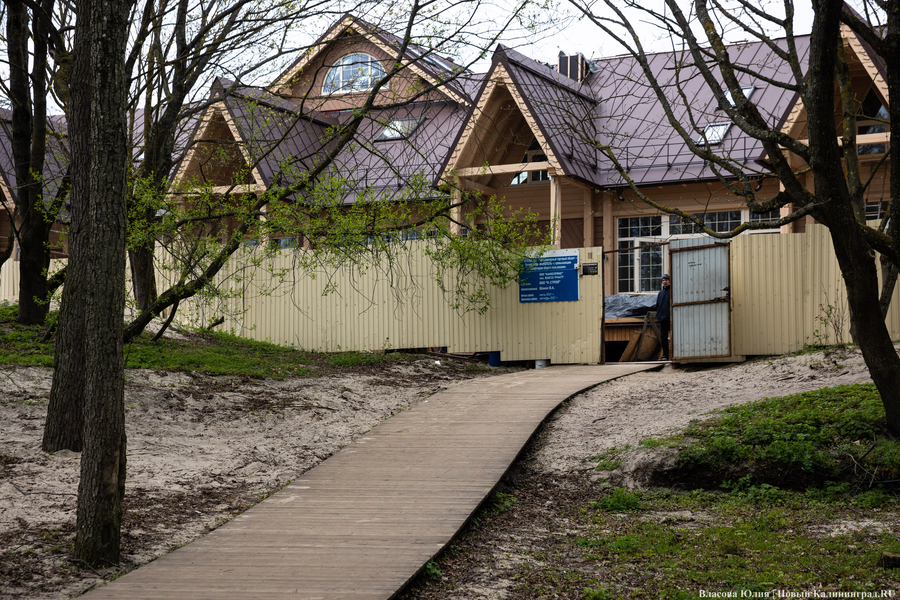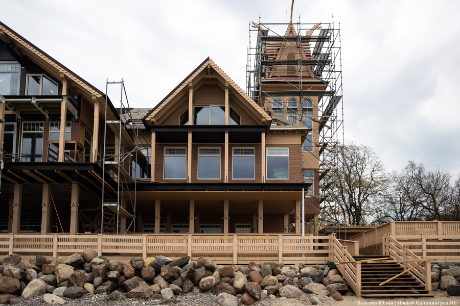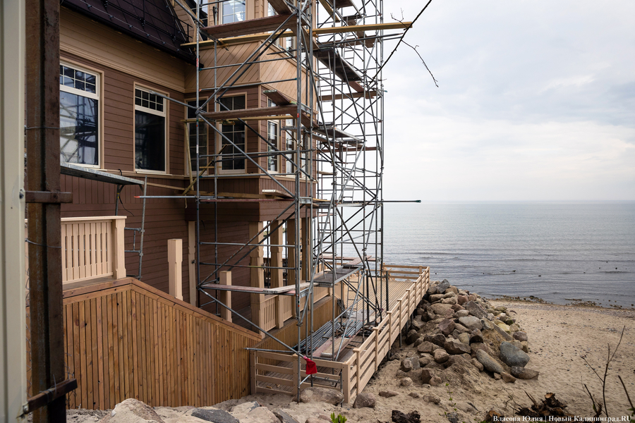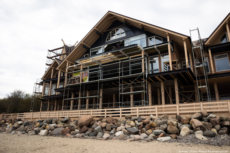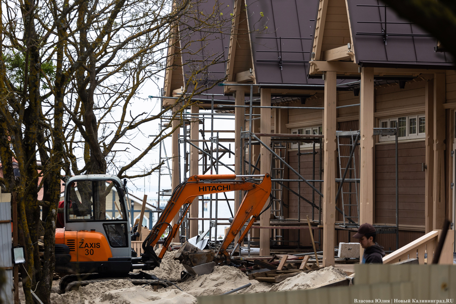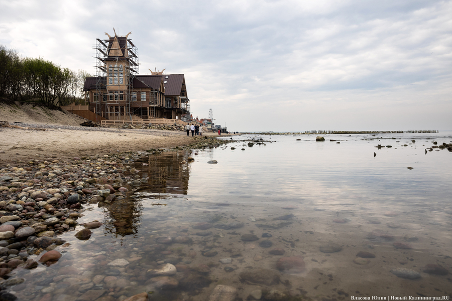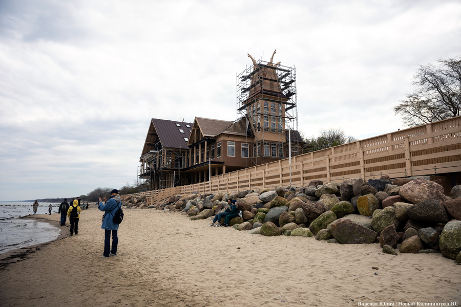 Стройка местами трехэтажного «НТО» идет полтора года. Зеленоградские власти летом 2021-го сообщали, что это будет «кафе в историческом стиле»: «Архитектура объекта разработана максимально приближенной к зданию конца XIX века, которое ранее располагалось на променаде города курорта Кранц». Видимо, для достижения максимального «историзма» при строительстве срыли авандюну и уничтожили остатки «сковородки». О масштабах «нестационарного» здания говорит и то, что оно захватило кусок пляжа практически на всю его ширину: зимой море вплотную подбирается к стенам, и обойти их по песку невозможно.