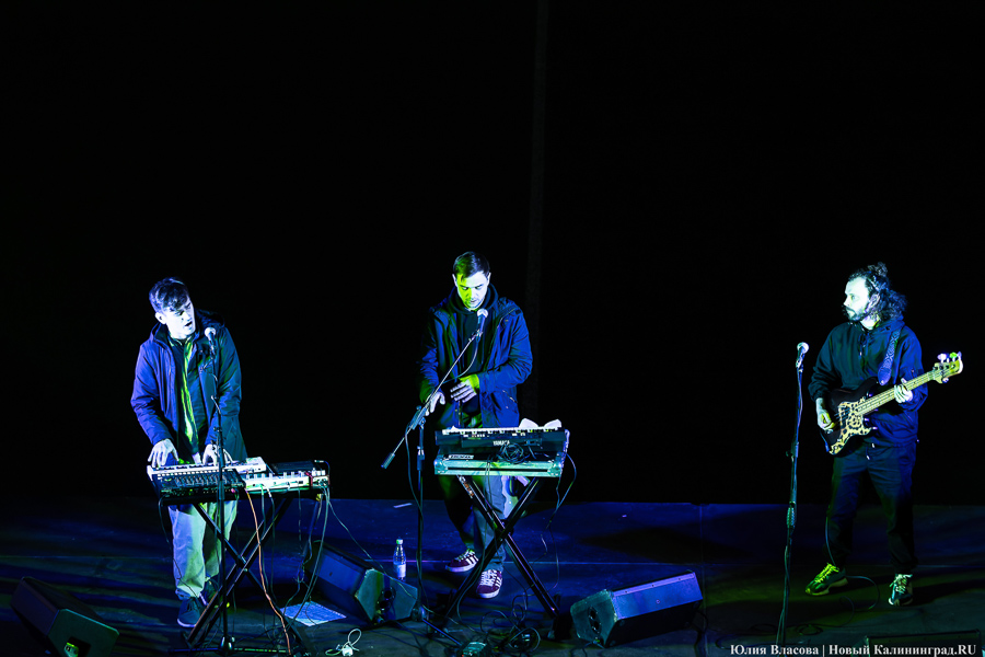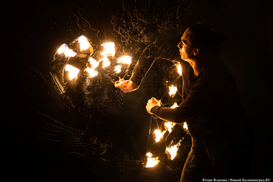 К чести «Фридландских ворот» — здесь любопытно поработали с пространством и устроили концерт на воде. В крепостной ров, который в дневное время выглядит довольно угрюмо, запустили уставленный свечами плот со скрипачкой и подсветили всё это видеопроекцией — такого в обычный день здесь точно не увидишь. Аналогичным путём пошёл и Музей янтаря. На зелёном валу — территорией между башней Дона и набережной Верхнего озера — организовали выступление группы «ЛондонParis» (одобряем) и фаер-шоу (да, ещё одно).
