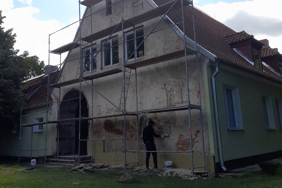 На фасаде дома культуры в посёлке Грачёвка зашили утеплителем историческую роспись. Ремонтом здания занимается администрация Зеленоградского округа.