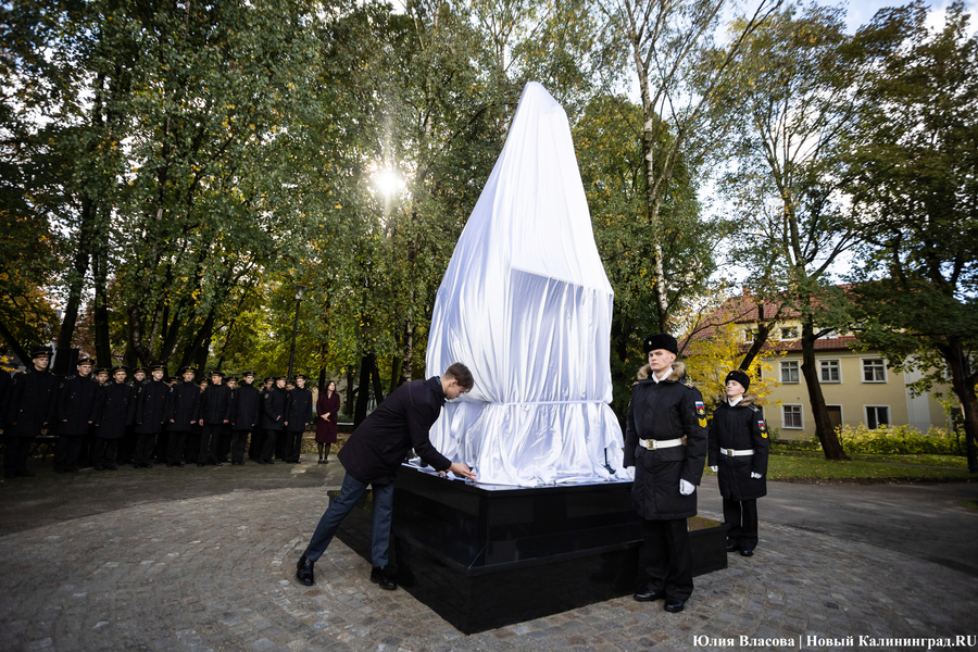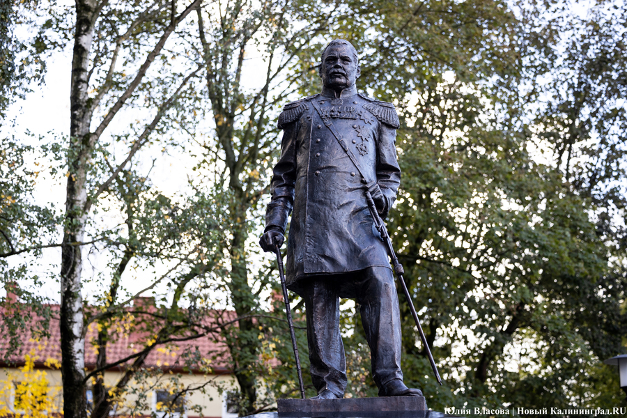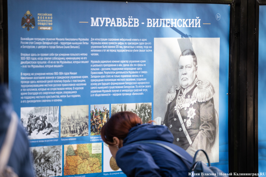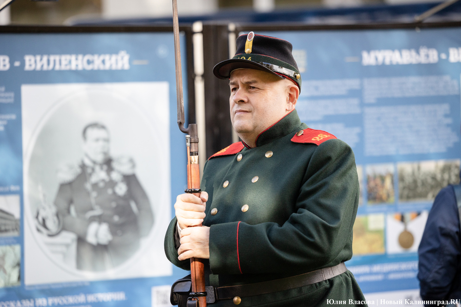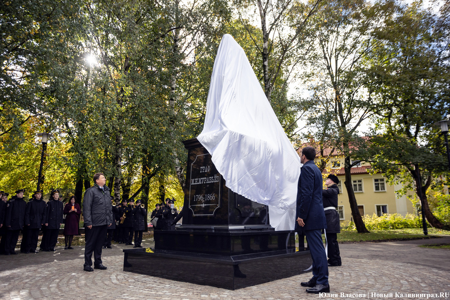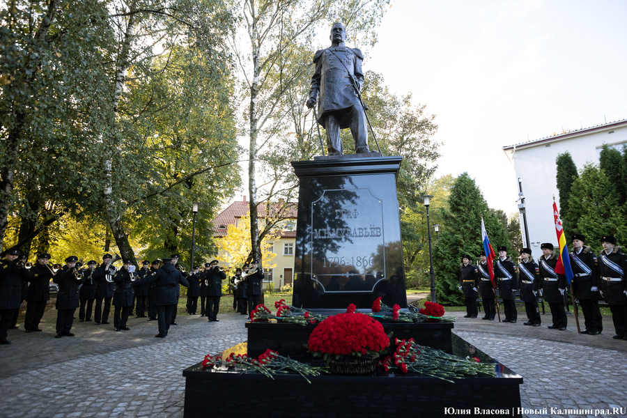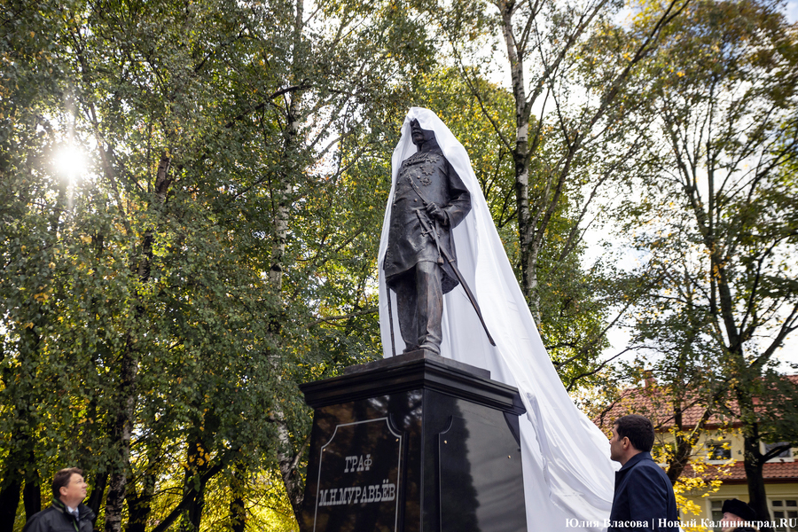 С местом для памятника графу Муравьеву определились ещё весной. Увековечить генерал-губернатора, прославившегося подавлением польских восстаний в Северо-Западном крае, решили у корпуса БФУ им. Канта на улице Озерова, в паре шагов от консульства Литвы. В день открытия здесь собрался целый кворум чиновников из регионального правительства и администрации города, смешавшись с толпой кадет и студентов. Ведущий приветствует гостей «знаменательного события» и приглашает губернатора Антона Алиханова и сенатора от Калининградской области Александра Шендерюка-Жидкова снять драпировку со скульптуры и наконец-то представить её людям. Под белой тканью показывается бронзовая фигура Михаила Муравьева на двухметровом постаменте.