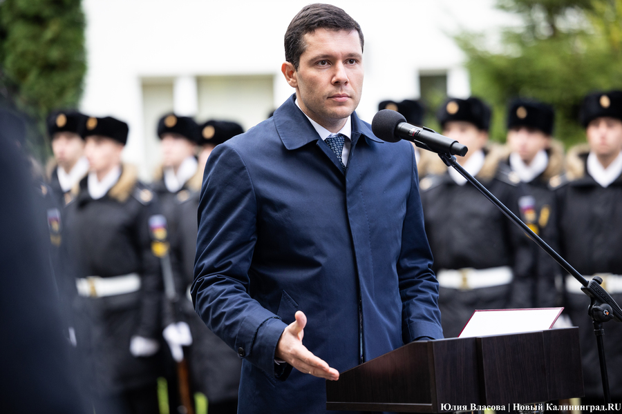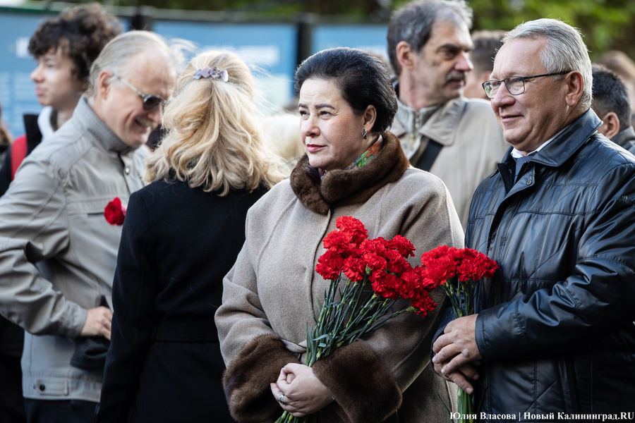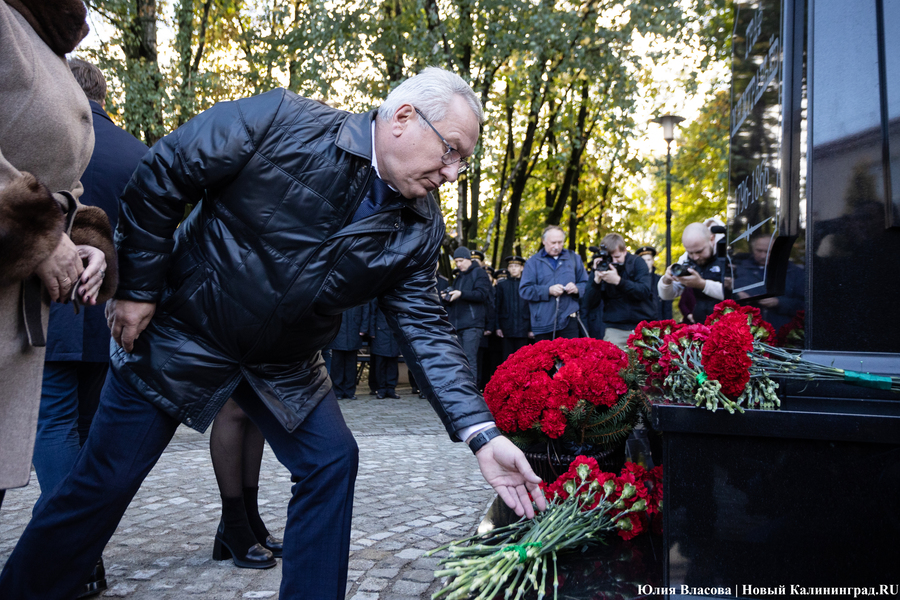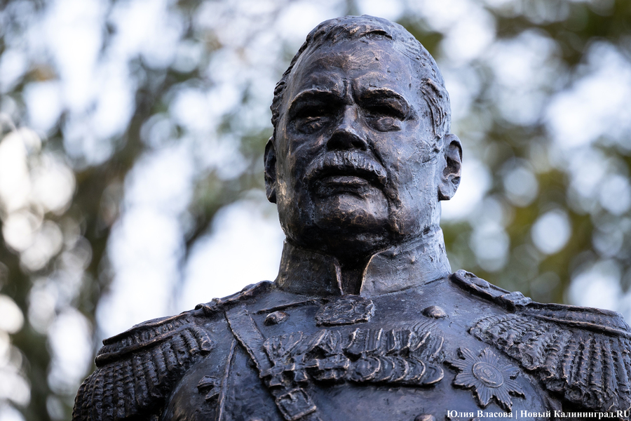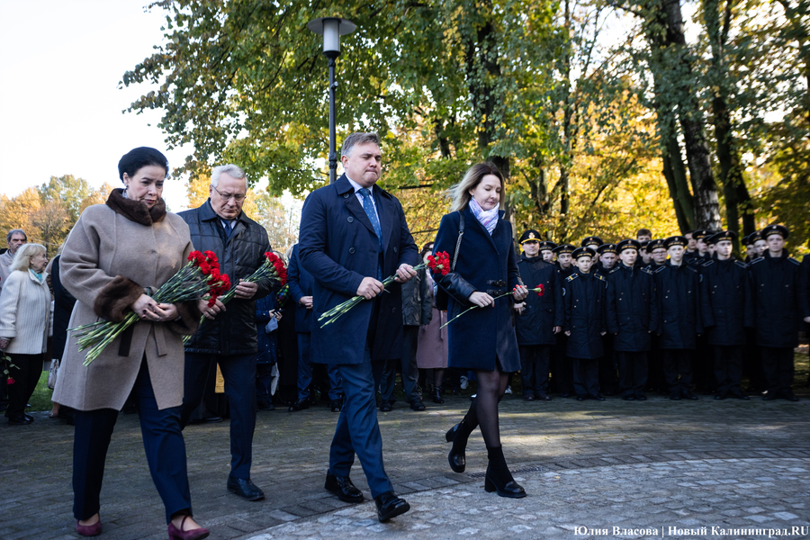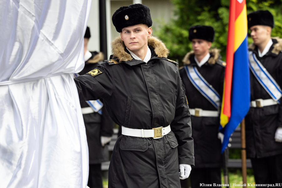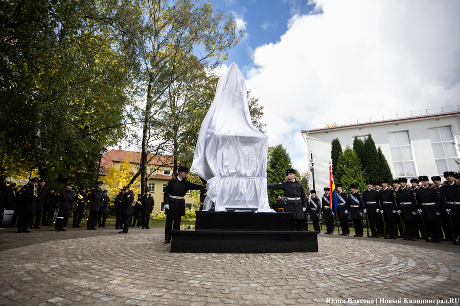 С местом для памятника графу Муравьеву определились ещё весной. Увековечить генерал-губернатора, прославившегося подавлением польских восстаний в Северо-Западном крае, решили у корпуса БФУ им. Канта на улице Озерова, в паре шагов от консульства Литвы. В день открытия здесь собрался целый кворум чиновников из регионального правительства и администрации города, смешавшись с толпой кадет и студентов. Ведущий приветствует гостей «знаменательного события» и приглашает губернатора Антона Алиханова и сенатора от Калининградской области Александра Шендерюка-Жидкова снять драпировку со скульптуры и наконец-то представить её людям. Под белой тканью показывается бронзовая фигура Михаила Муравьева на двухметровом постаменте.