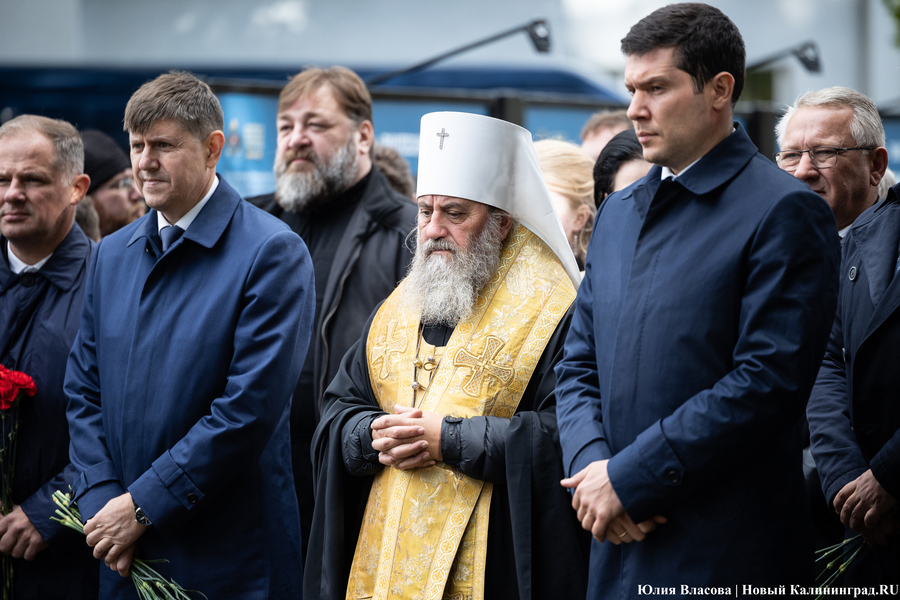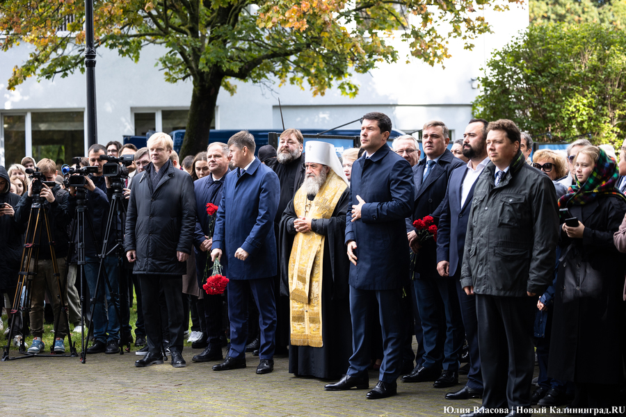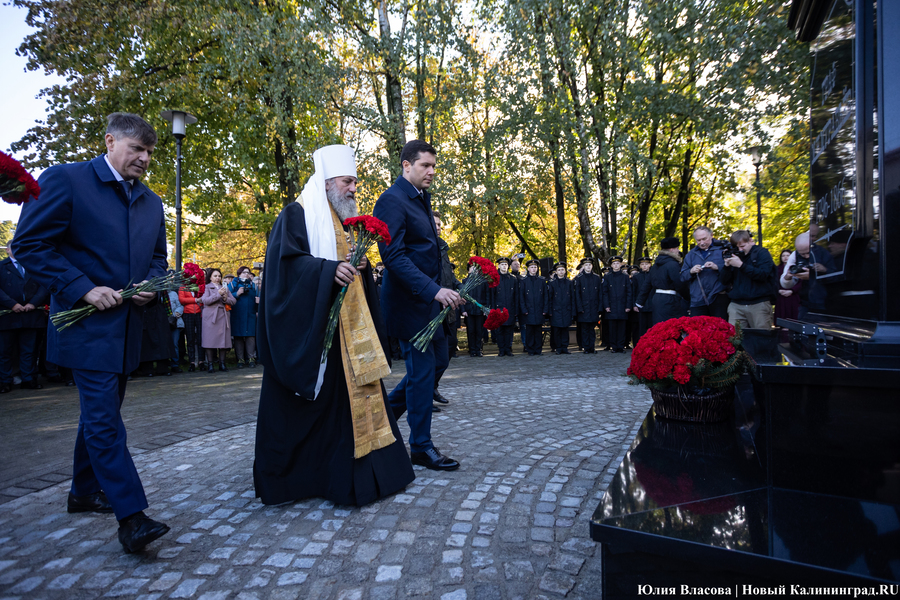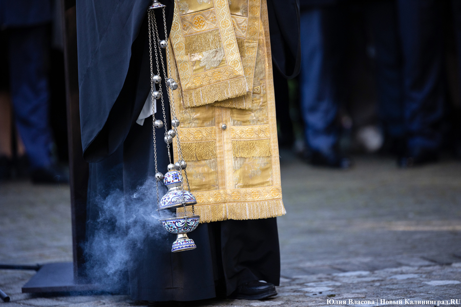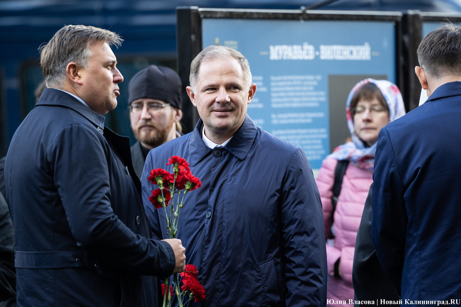 После всех торжественных речей глава калининградской епархии РПЦ митрополит Серафим совершает у памятника заупокойную литию: православные песнопения, кадило, запах ладана — всё по протоколу. Во время общения с журналистами он говорит о Михаиле Муравьеве как о настоящем христианине, который возлюбил Бога через человека. «Он был христианином на практике, настоящим. Не тем, кто говорит „Я верую в душе“, а делами совершенно противоположно живёт», — утверждает митрополит. На вопрос о том, не находит ли он противоречия в любви к ближнему и политических методах Михаила Муравьева глава местной епархии заявляет: «Хирург тоже делает операцию, когда это нужно. Чтобы спасти жизнь человека, он делает иногда и больно. Думаю, как руководитель он [Михаил Муравьев] понимал, что где-то и нужно что-то сделать, чтобы более глобально спасти людей».