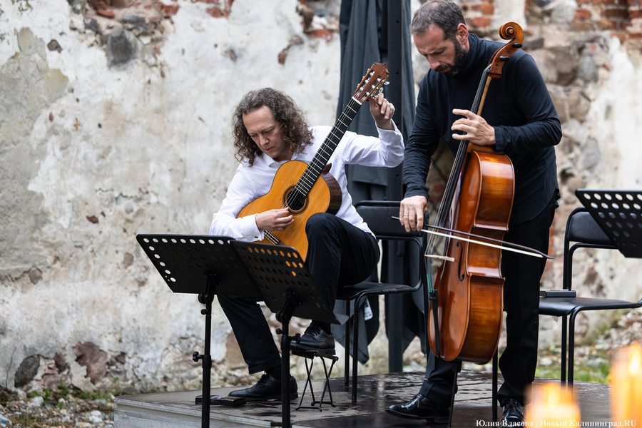 Борис Андрианов открывает концерт прелюдией из Третьей виолончельной сюиты Баха, зрители одновременно раскрывают зонтики из-за начавшегося дождя — крыши в древнем здании нет, здесь сохранились лишь стены. Поднимающийся ветер заставляет на мгновенье остановиться и артиста, чтобы закрыть инструменты от воды. Однако погодные условия совершенно не портят настроение публики.