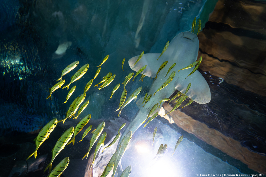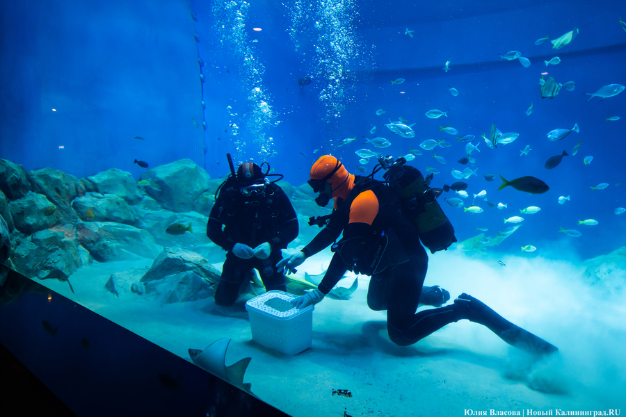 Сейчас в корпусе «Планеты Океан» более двух тысяч гидробионтов, то есть морских организмов. Как отметил руководитель проекта в Калининграде ООО «Аква Лого Инжиниринг» Сергей Сбитнев, по идее, самым неприхотливыми из них должны быть местные рыбы — красноперка, окунь. Но это оказалось не так. «У нас настолько хорошая вода, что для многих рыб это является стресс-фактором, пояснил он. — Приходится приучать рыб к идеальным условиям».