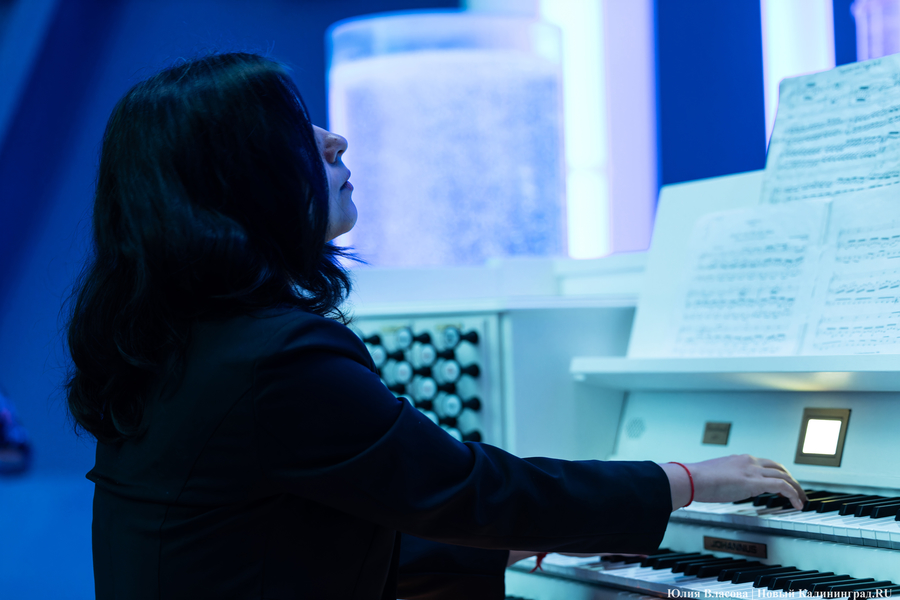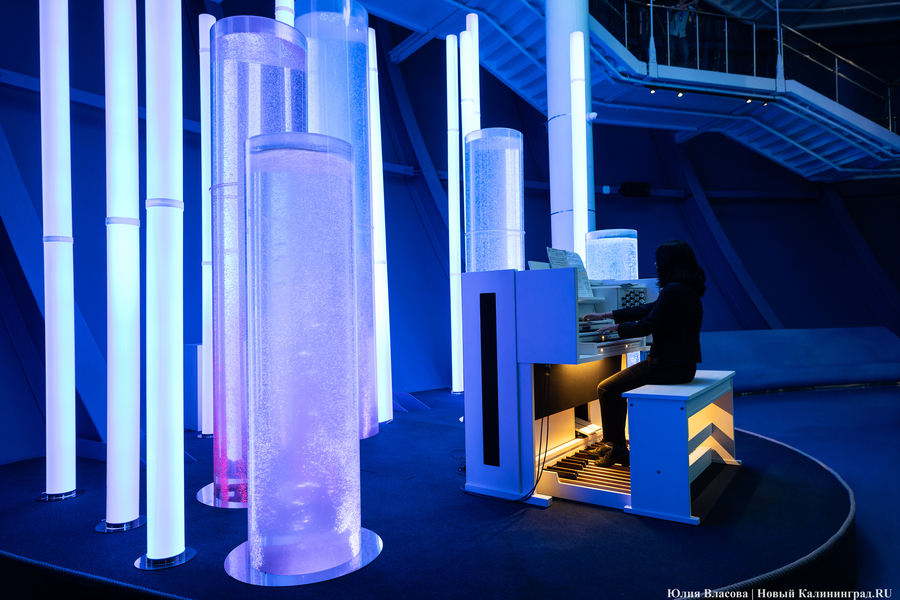 А ещё в этом зале звучит музыка. Органная хоральная прелюдия Баха, та самая — из «Соляриса» Андрея Тарковского, в исполнении солистки областной филармонии Марии Гаврилюк. Этот саундтрек очень хорошо ложится на созданный антураж. Сразу представляешь себя на космической станции, медленно вращающейся вокруг далекой и малоизученный планеты с бескрайним, хранящим множество тайн океаном. И чтобы изучить, понять его, нужно сначала понять и изучить себя. Светлана Сивкова весьма к месту привела цитату Антуана де Сент-Экзюпери: «Мы научились летать в воздухе как птицы, плавать в воде как рыбы, теперь нам осталось научиться только жить как люди».