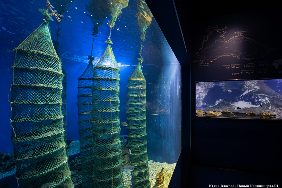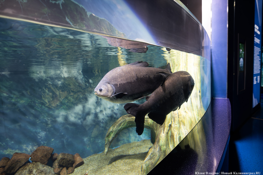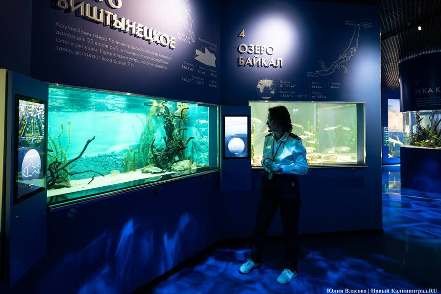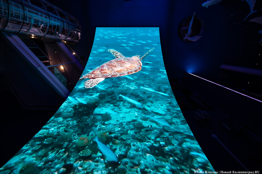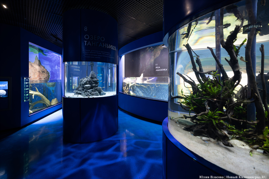 На этом «корабле» несколько «палуб». На одной из них разместились аквариумы, в которых можно увидеть обитателей самых разных морей, океанов, рек и озер. Например, реки Амазонки и озера Байкал. Температура и состав воды, как пояснили экскурсоводы, полностью соответствуют, скажем так, натуральным. Неудивительно, что стекла аквариумов с водой холодных морей, в частности, Белого, немного запотевшие — сказывается разница температуры внутри и снаружи аквариума.