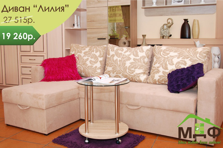 Компания «МДФ» уже более 15 лет изготавливает, тестирует и предлагает широкий ассортимент продукции мягкой и корпусной мебели, а также кухни и шкафы-купе по индивидуальным заказам. «У нас большой ассортимент обивочных материалов, поэтому любая модель дивана в кратчайшие сроки изготавливается из ткани, которая по душе именно вам, — заверяют в компании. — Каждая модель проходит высокий контроль качества и имеет гарантию 18 месяцев». В салонах компании действуют гибкие системы скидок. А сейчас до середины апреля на мягкую мебель скидки от 15% до 30%.