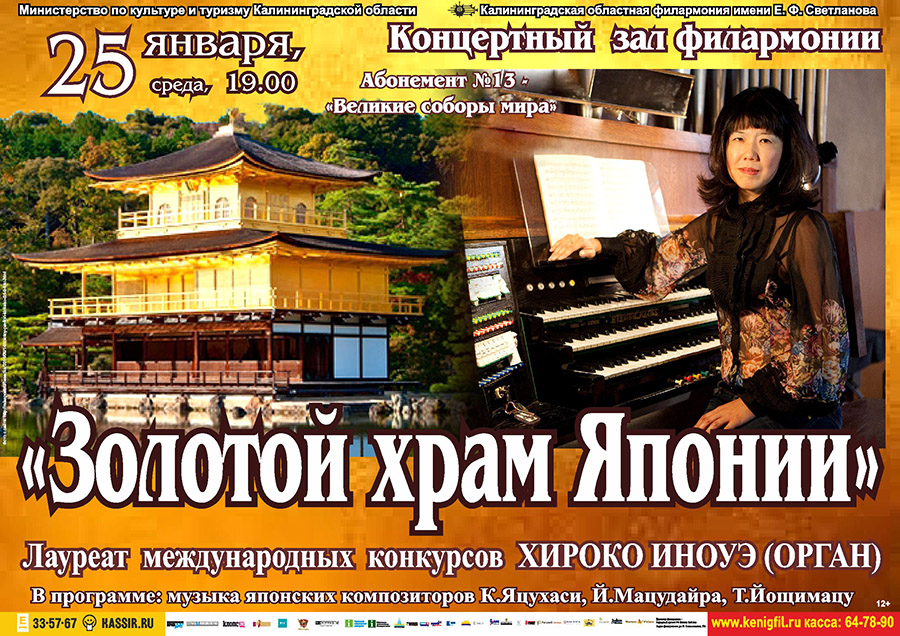 25 января в 19.00 на концерте «Золотой храм Японии» слушателей ждет встреча с двумя великолепными солистками филармонии — лауреатами международных конкурсов органисткой Хироко Иноуэ и пианисткой Анной Ушаковой. На суд зрителей они представят программу, навеянную чудесным Золотым павильоном, главной достопримечательностью красивейшего храмового комплекса