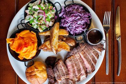 О том, из чего состоит фирменное блюдо «Блютгерихт» с тремя видами салата, печёным картофелем и картофельной булочкой, рассказывает шеф-повар заведения: