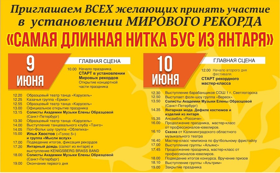 В этом году 9 и 10 июня в День города Светлогорска организаторы снова планируют организовать и подарить гостям и жителям города очередной праздник, уже II ежегодный фестиваль «Янтарные бусы», на котором планируется установить новые мировые достижения.