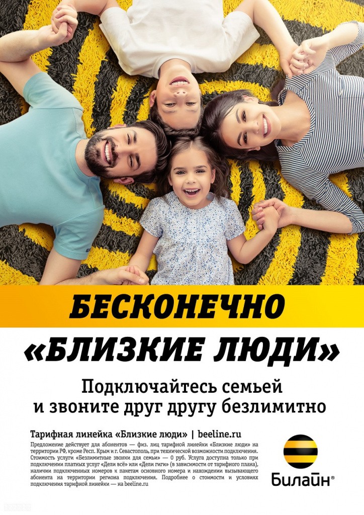 Предложение для физ. лиц — абонентов тарифных планов (ТП) «Близкие люди» 5/6 (кроме г. Москва), «Близкие люди» 4/5 (для г. Москва). Тарифная линейка «Близкие люди» доступна на территории РФ, кроме Республики Крым, г. Севастополь, при технической возможности подключения. Стоимость услуги «Безлимитные звонки для семьи» — 0 руб. Услуга доступна только при: 1) подключении платных услуг "Дели все"/"Дели гиги" в зависимости от ТП (при подключении до 30.06.2020 эти услуги предоставляются со скидкой 100%), 2) наличии подключенных к основному номеру дополнительных номеров, 3) нахождении вызывающего абонента в регионе подключения. Подробнее об организаторе акции, стоимости и условиях подключения — на beeline.ru.