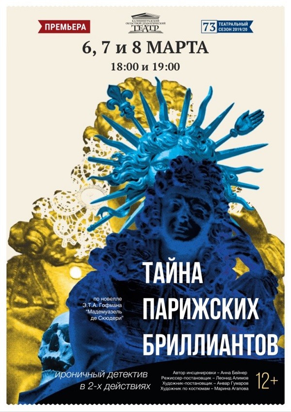 6, 7 и 8 марта в калининградской драме — премьера. Над ироничным детективом «Тайна парижских бриллиантов»(12+) с труппой театра работает главный режиссер санкт-петербургского Театра им. Комиссаржевской Леонид Алимов. В основе спектакля — новелла Эрнста Теодора Амадея Гофмана «Мадемуазель де Скюдери. Хроника времён Людовика XIV». Инсценировка Анны Бейнер.