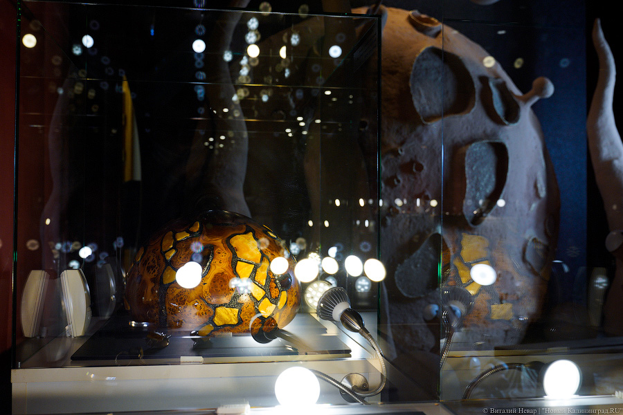 Перстень «Ала», выполненный польским художником Анджеем Шадковским из цельной янтарной капли, отсылает нас к плакату фильма Ридли Скотта «Чужой», снятого в 1979-м — том же году, когда был открыт Музей янтаря. Непосредственно к космосу кольцо отношения не имеет — оно просто напоминает объект, изображенный на постере одной из самых известных в мире научно-фантастических кинолент. Рядом с ним — кольцо «Большой взрыв». Это работа художника Анджея Адамски из Бранева, которая, напротив, заставляет задуматься о происхождении Вселенной. Если посмотреть на само кольцо и на размещенный тут же фотоснимок туманности «Сердце», становится понятно, почему янтарь часто используют в отсылках к космической тематике.