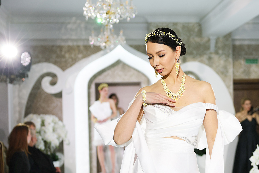 «Здание находилось в плачевном состоянии, хотя когда-то оно было шедевральным. Мы понимали, что его нужно восстановить, и гордимся, что дали ему второе рождение, — рассказывает о проведённой реставрации генеральный директор Калининградского янтарного комбината Михаил Зацепин. — Здание восстанавливали трудом всего коллектива. Это было непросто, но мы вложили сюда не только труд, но и сердце, душу, любовь, чтобы в области была площадка, на которой можно экспериментировать с янтарем и модными трендами, раскрывать таким образом всю красоту камня».Для дебютного показа выбрали коллекции калининградских дизайнеров Виктории Ильинской, Марии и Дарьи Титовых, свадебного салона Garteli, а также работы студентов Института искусств Российского государственного университета им. Алексея Косыгина. «Янтарь — это камень, который у меня в душе, — говорит Виктория Ильинская. — Я коренная калининградка, и когда прогуливаюсь по морю, всегда ищу янтарики. Этот камень живой, в нём можно разглядеть самые разные грани красоты». На подиуме обработанный вручную янтарь и нешлифованный камень с естественной корочкой сочетали с шёлком, атласом, шифоном, тюлем, кружевом и макраме. Для самых смелых — кожаные чокеры с костяным янтарём и цепи через всё тело, для приверженцев классики — оправленные в серебро камни сложных оттенков и многоярусные бусы.