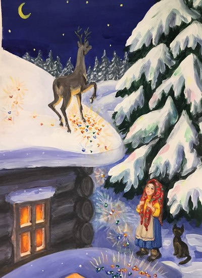 Сказка об ожидании чуда, которое случится, если верить в него и делать добро! Это необыкновенно лиричная, очень светлая история о маленькой девочке, ее кошке и дедушке-охотнике, о мечте однажды увидеть сказочного оленя и драгоценные камушки, летящие из-под его копытца. В сказке много танцевальных этюдов, сказочного света и музыки, но главное — это сам текст и великолепные актеры, его разыгрывающие и перевоплощающиеся в сказочных персонажей. После сказки — фотосессия с персонажами и поздравления от Деда Мороза и Снегурочки.