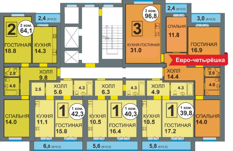 В жилом комплексе «Дадаевский» представлены однокомнатные квартиры 40–44 кв. м, двухкомнатные 65–66 кв.м и, конечно, евро-четырёшки площадью 98–100 кв.м.