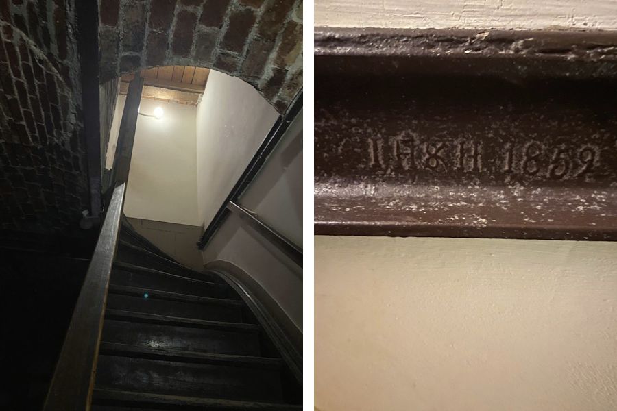 Дата подтверждает, что в середине 19-го века была проведена большая реконструкция здания. Рельс, встроенный в конструкцию лестницы с каминного зала на второй этаж, в то же время является частью крепления. Немцы, когда строили замки, дома богатых горожан или поместья, специально в фундаменте закладывали памятные камни с годом начала строительства.
