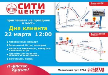 Торговый центр «Сити» приглашает на празднование Дня клиента! 22 марта у вас есть прекрасная возможность весело и задорно провести выходные. В знак благодарности к любимым покупателям в торговом центре будет организовано праздничное мероприятие, где гостей будут ждать невероятные конкурсы, отличное настроение и масса бесплатных удовольствий. Этот прекрасный весенний выходной день подарит всем посетителям «Сити» море развлечений:
